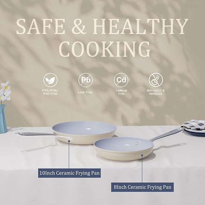 • 𝗖𝗿𝗮𝗳𝘁𝗲𝗱 𝗪𝗶𝘁𝗵𝗼𝘂𝘁 𝗛𝗮𝗿𝗺𝗳𝘂𝗹 𝗖𝗵𝗲𝗺𝗶𝗰𝗮𝗹𝘀 & 𝗡𝗼 𝗣𝗙𝗔𝗦/𝗣𝗧𝗙𝗘/𝗣𝗙𝗢𝗔 - Superior to Traditional Non-Stick Coating Pans: Crafted with 3X Durable Ceramic Coating, our 8-inch nonstick frying pan is 100% free from PFAS, PTFE, PFOA, lead, and cadmium. Healthier cooking with 50% less oil – perfect for eggs, pancakes, or grilled cheese. Proven Safety: 800+ lab tests ensure zero chemical release even at 500°F.