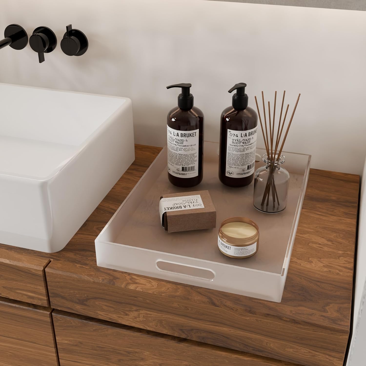 16"x12" Large Acrylic Serving Tray Decorative Ottoman Coffee Table Vanity Tray Tea Fruit Platter Snack Appetizer Dessert Drink with Handles for Bar Kitchen Party, Frosted