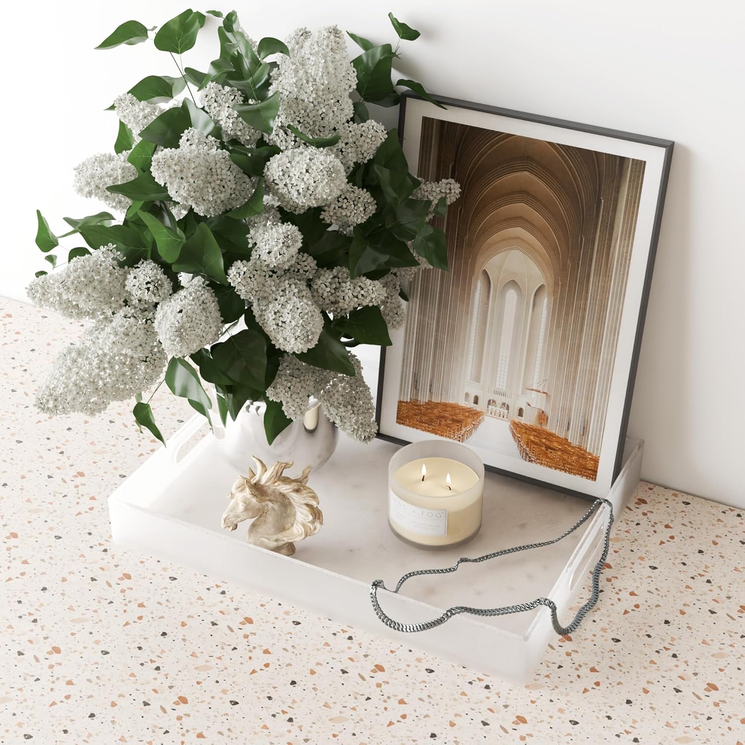 • MULTIPURPOSE ORGANIZER: Our tray can hold coffee, food, tea, fruit, snacks, appetizers, desserts, and drinks at the bar, kitchen, or party according to your needs. Additionally, it can also function as a vanity tray for bathroom, counter, or dresser tops while doubling up as an organizer for remote controls, magazines, makeup, toiletries, and more. Its adaptable design makes it a suitable addition to kitchens, bathrooms, vanity areas, and bars.