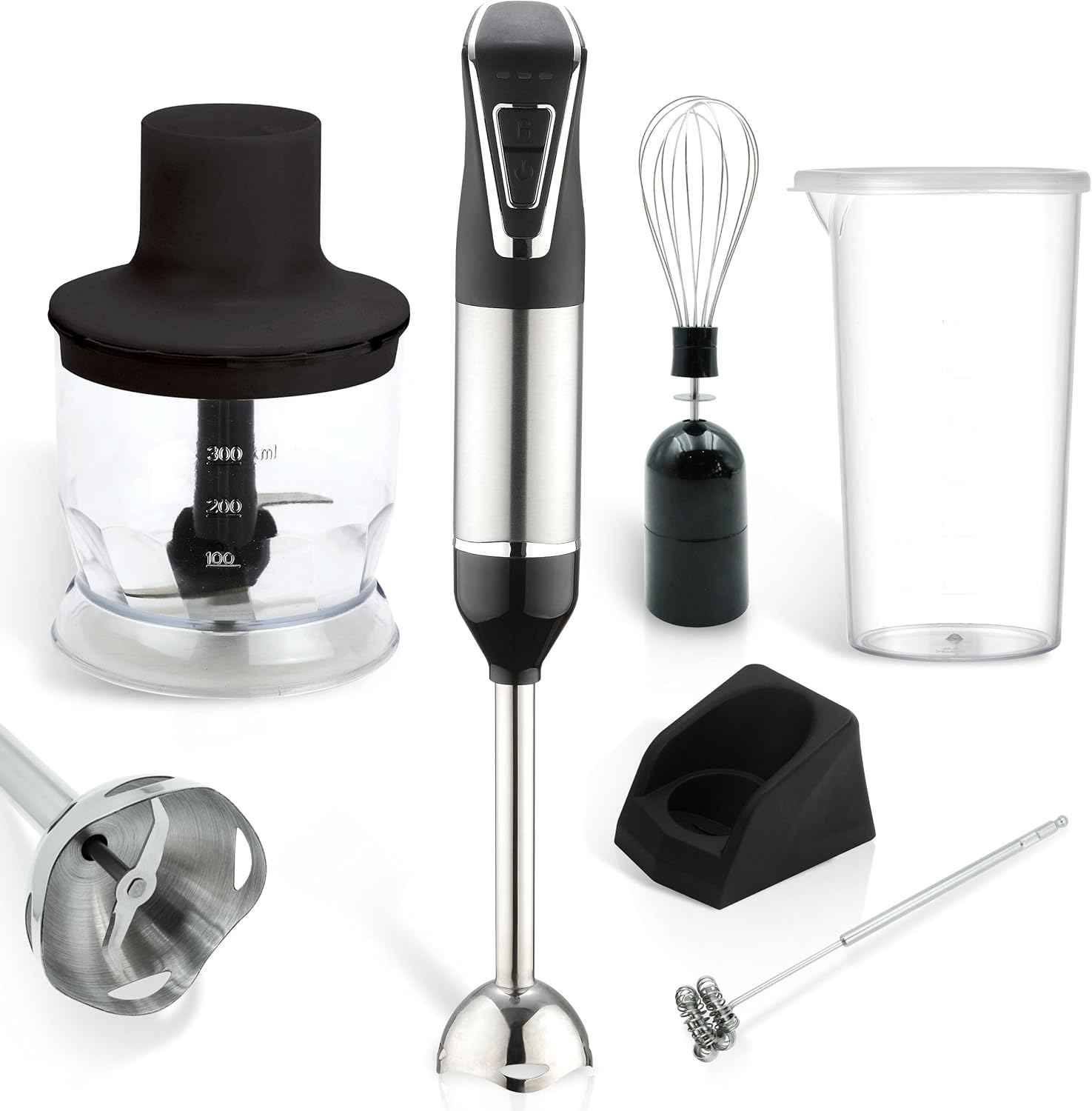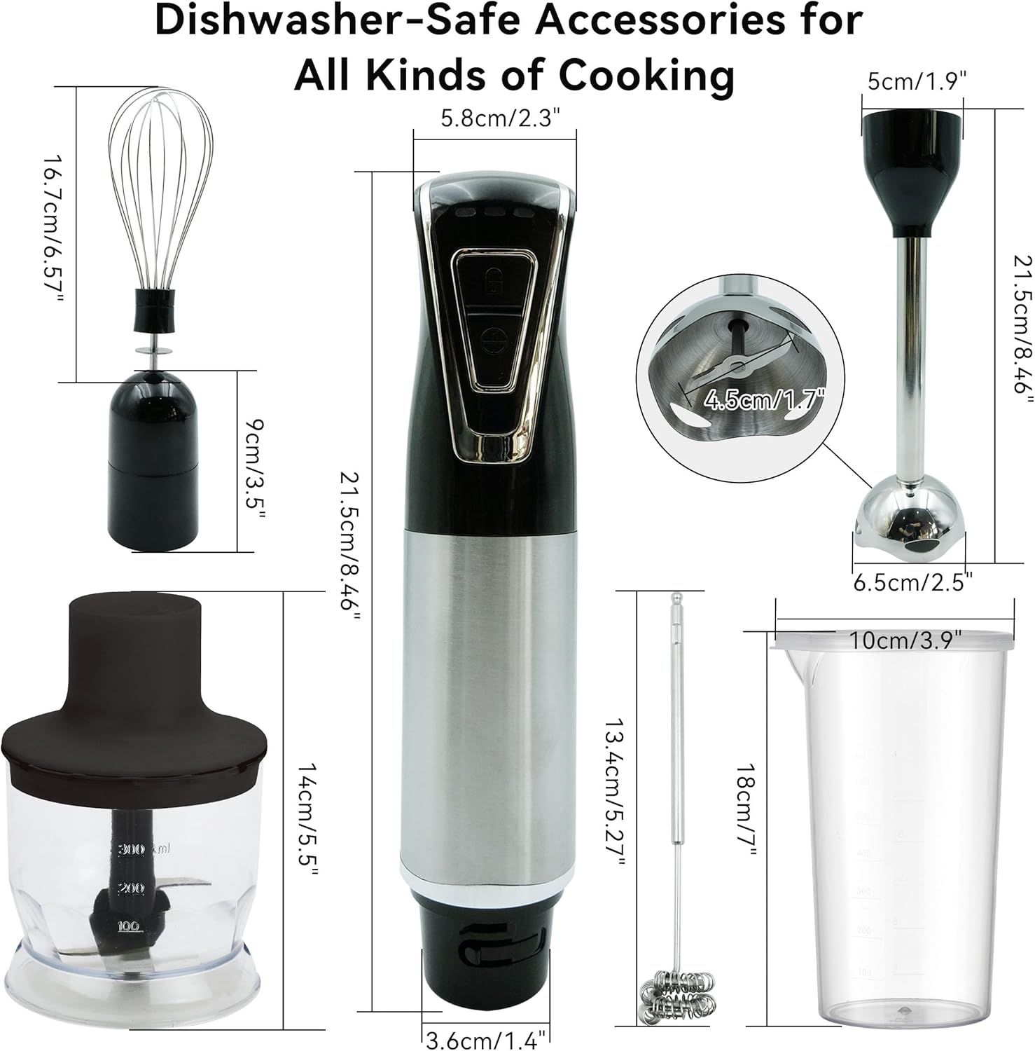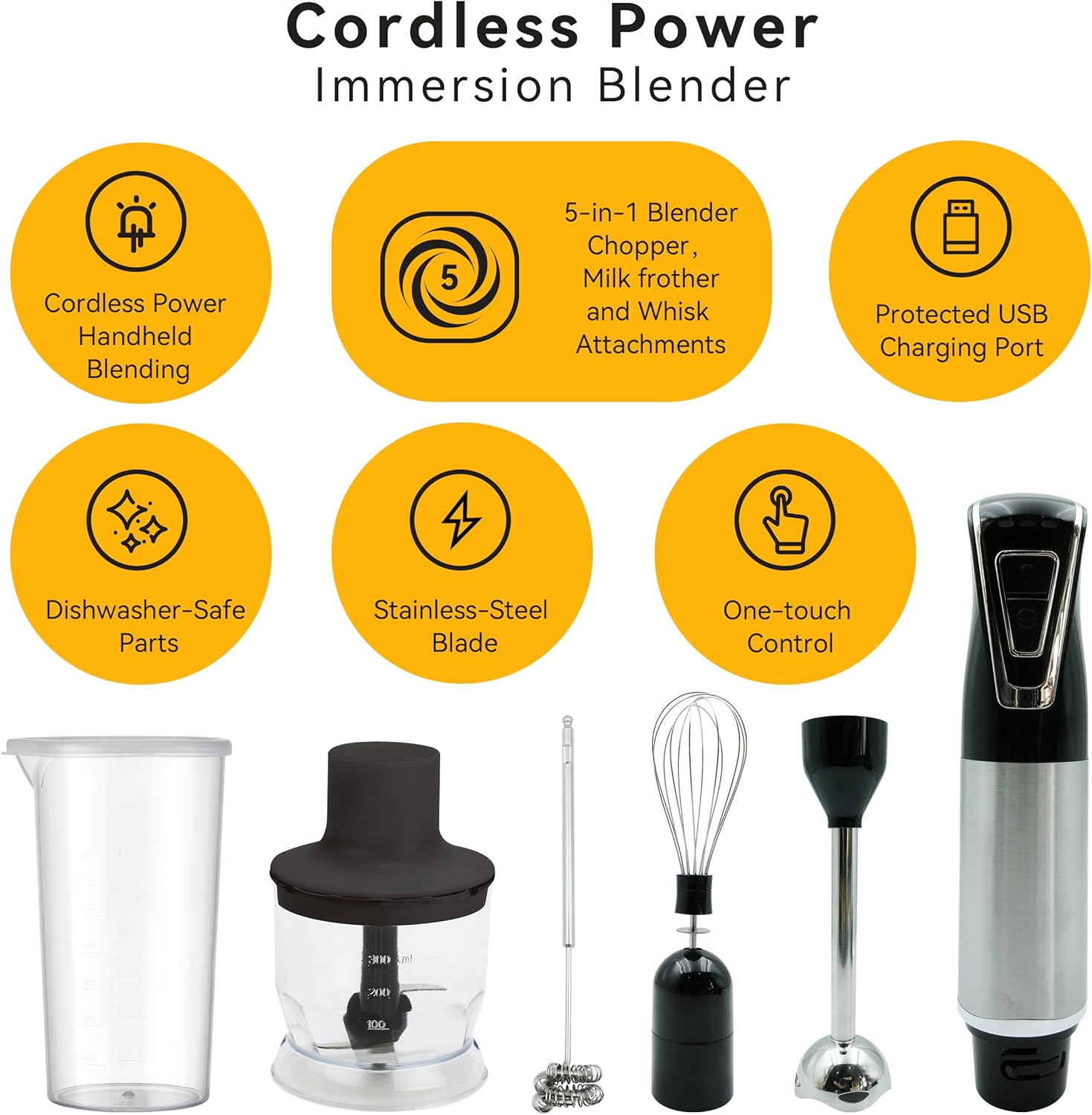 Cordless Portable Immersion Blender 5-in-1 Blender Set, Ice Crushing Power with One-Touch Speed Control, Comes with Potato Masher, Whisk, Chopper, Beaker, and Storage Case, Stainless Steel