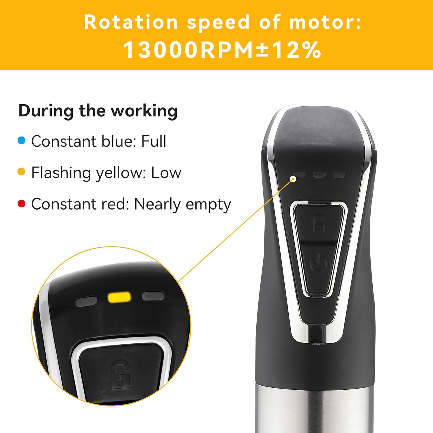 • 【Cordless & USB Rechargeable】: This handheld blender features a cordless design with a high-performance rechargeable NCM battery, delivering optimal runtime and performance. Free from tangled wires, it offers enhanced convenience. When the battery needs charging, the indicator light will flash as a reminder. Simply use the included convenient USB cable for easy charging.