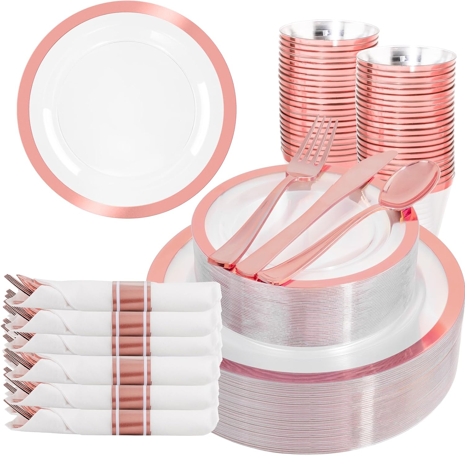 • EXQUISITE DESIGN:These rose gold plastic plates are eye-catching with wide rose gold rim, perfect for daily or holiday, creating a chic and stylish table setting.These heavy duty disposable plates also can be used as Mothers day gifts or Easter gift.
