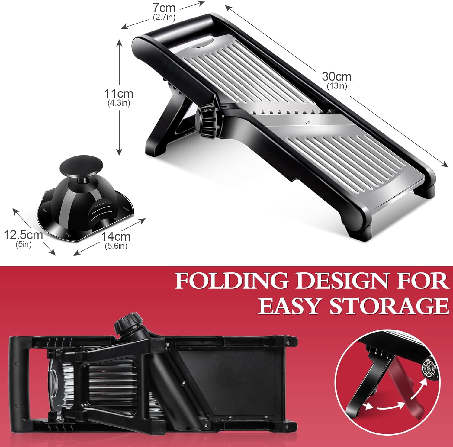 • Easy to Clean and Store:The built-in blade can be easily removed. Simply slide the knob to the “OUT” position and lift it up. Easy to clean under running water, we supply a cleaning brush so you don't have to touch the steel blade during cleaning. Mandolins food slicer with foldable non-slip feet for easy use. It can be folded flat or hung on the wall for easy storage.