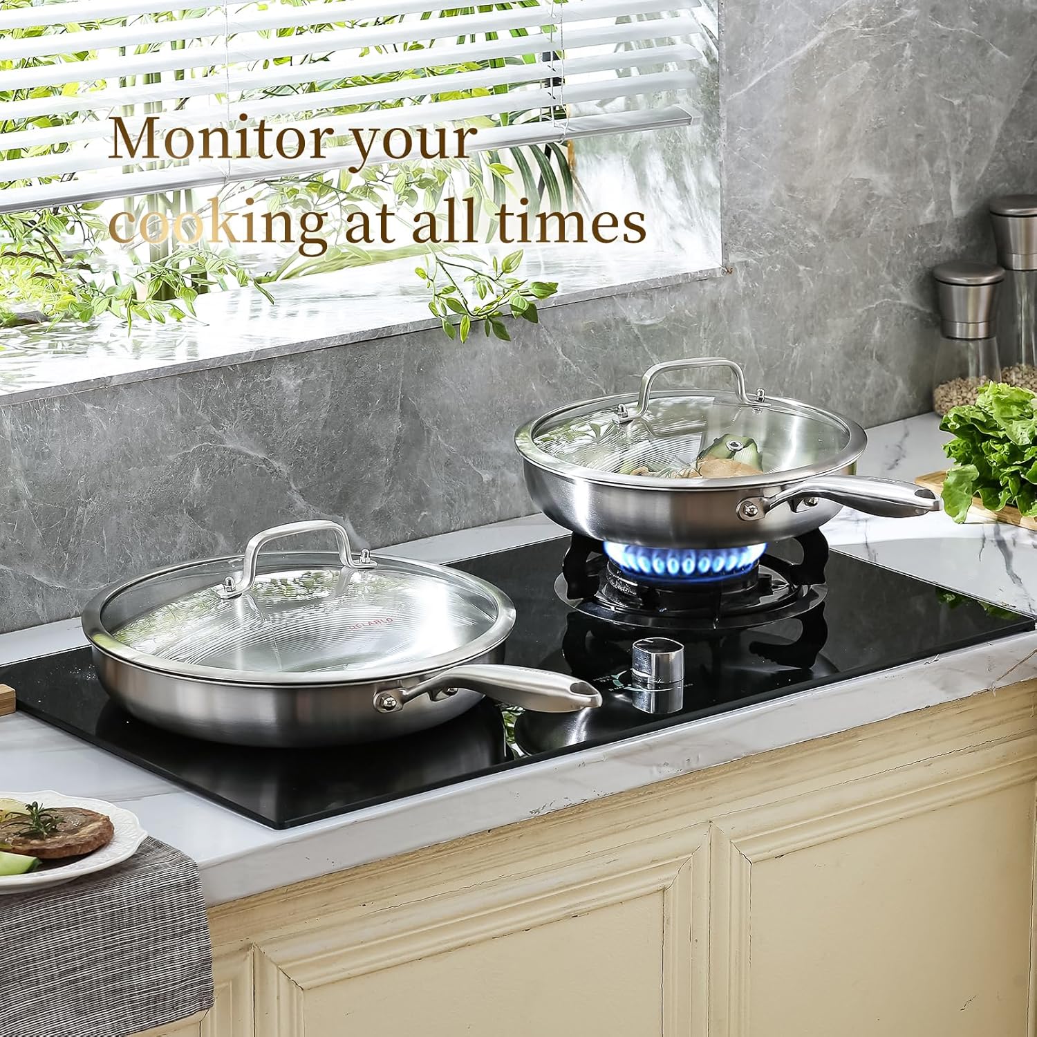 DELARLO Tri-ply Stainless Steel Kitchen Cookware Frying Pan Set with Lid 8" 10" 12" Induction large Skillets Chef's Pan,Pots and Pans Set Kitchen Cookware Set Suitable for All Stove