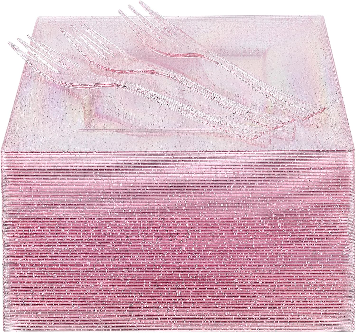 DaYammi 100Pcs Pink Dessert Plates Including 50Pcs Appetizer Plates,50Pcs Plastic Forks,Glitter Square Plate with Cake Fork,pink Disposable plates for Wedding,Plastic Salad Plate for Birthday Party