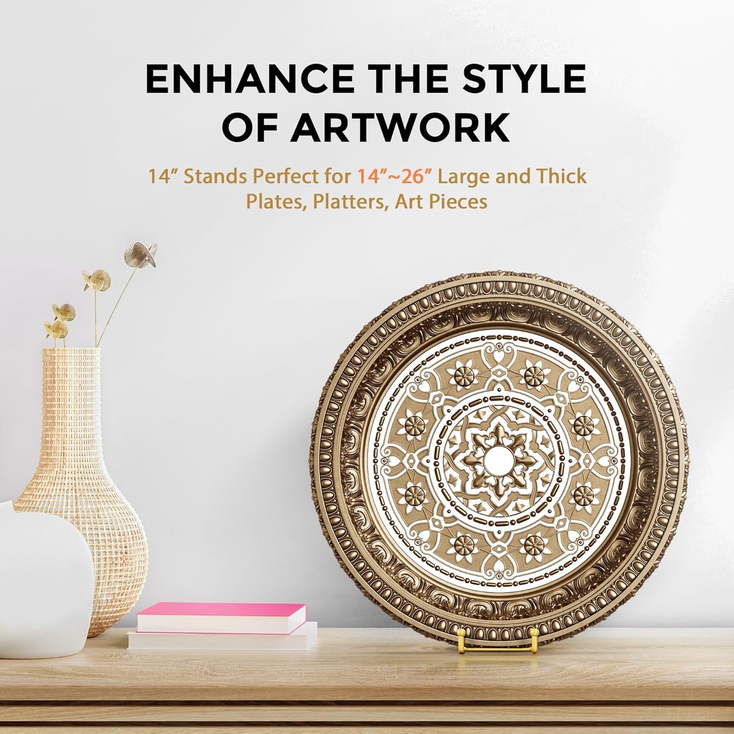 • Chic 14-Inch Gold Metal Plate Stand for Large Items supports 14 to 34-inch plates, Picture Frames, platters, or art up to 20 lbs with a 2.75-inch lip and 10° tilt for secure, stylish display