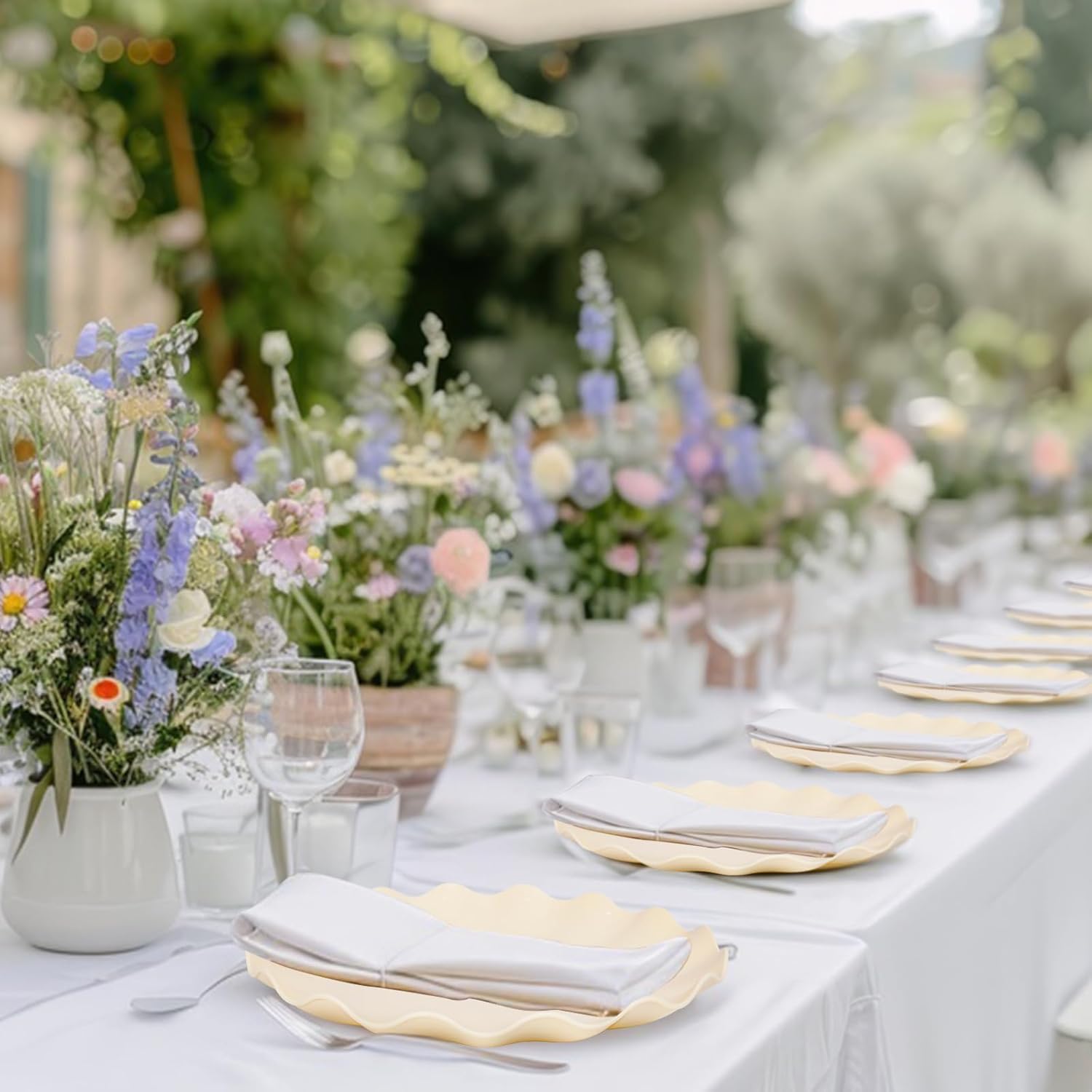 • 【Light luxury Beige plastic plates】The classic plastic plates reusable,paired with exquisite scalloped edges,instantly elevates the dining table style for weddings,bridal showers,or holiday parties.The unique beige and yellow color scheme perfectly blends with themed decorations such as weddings,creating a relaxed and luxurious atmosphere for buffet and dinner tables!
