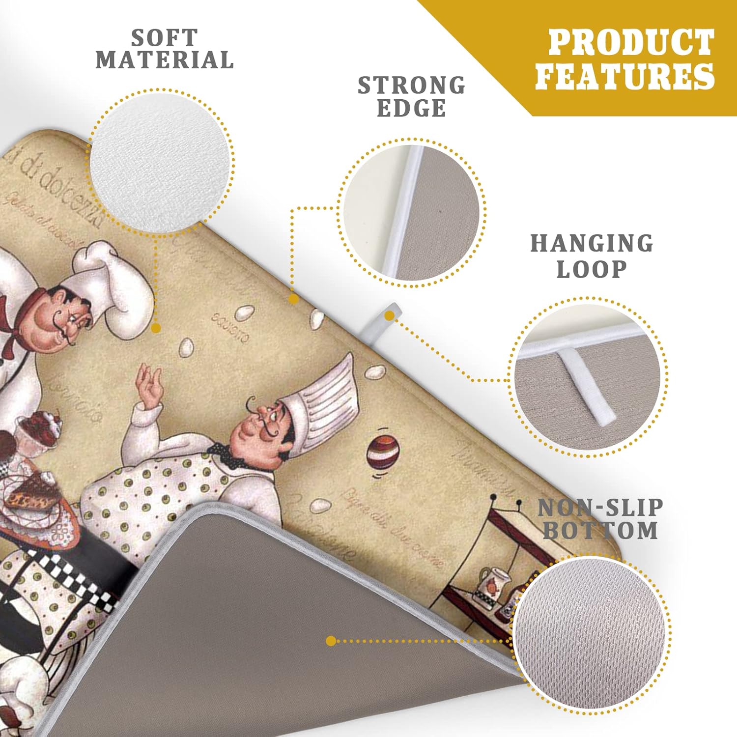 • 【Dish drying mat size】 16x18 inches, high quality polyester fat chef dish drying mat. Made of microfiber,super absorbent and fast drying dish drying mat. Absorbent microfiber, in a 3-layer design without sacrificing its softness. Both sides can be used, one with a Chef Kitchen pattern, the other with a gray non-slip bottom.Chef drying Mat for Coffee Bar Countertops fits most countertops while providing a smart, sharp look.