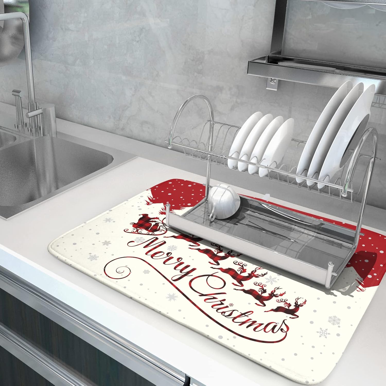 Christmas Moose Dish Drying Mat 16x18 Inch Cute Christmas Elk Drying Mat for Kitchen Counter Xmas Winter Santa Claus Absorbent Reversible Microfiber Dishes Pad Dish Drainer Mats Kitchen Accessories