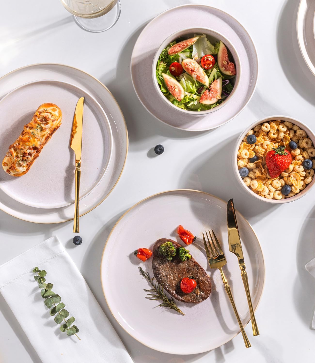 • STACKABLE & EASY TO CLEAN: Our dinnerware set is designed to be stackable. making it ideal for space-saving storage in your kitchen cabinets or pantry. This design helps free up space for other dining sets. The smooth surface makes them easy to clean. You can wash them with soap and hot water, or simply place them into your dishwasher.