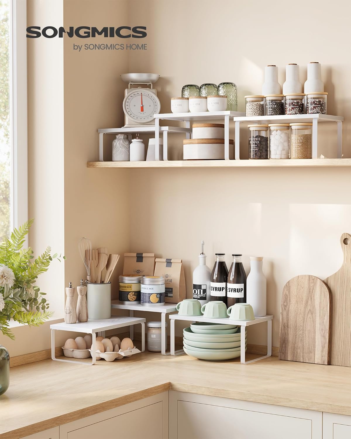 SONGMICS Cabinet Organizer Shelf, Set of 3 Kitchen Counter Shelves, Kitchen Storage, Spice Rack, Stackable, Expandable, Snow White and Matte White UKCS220W01