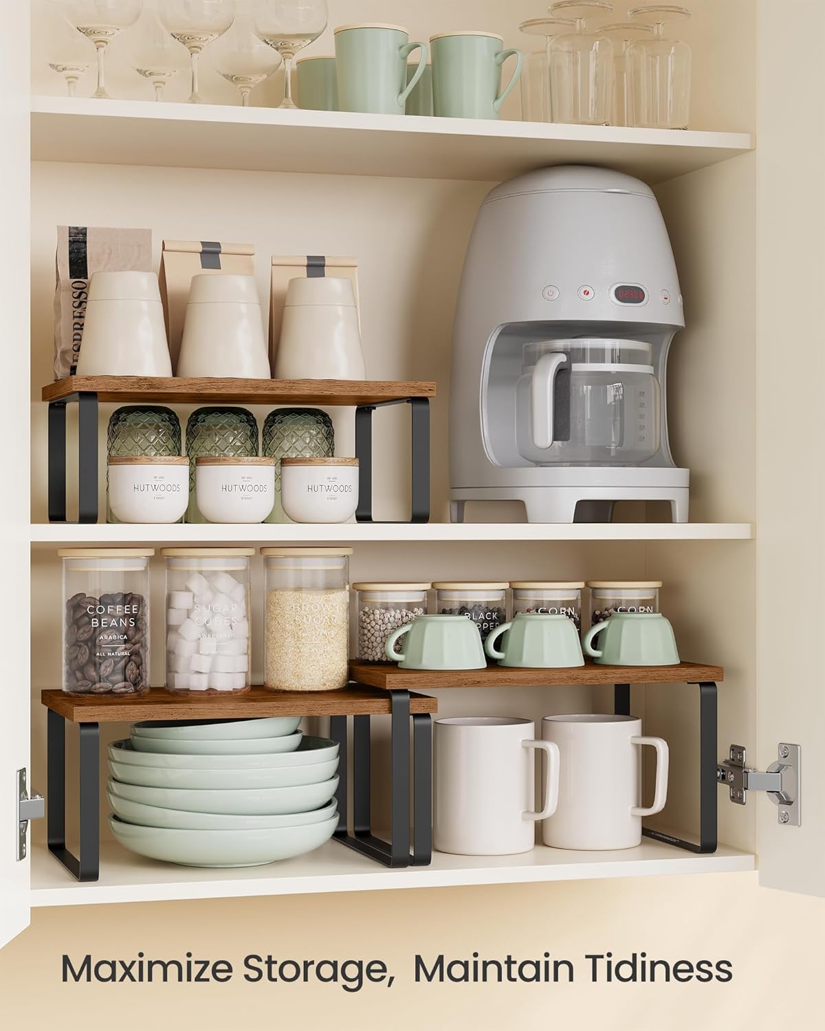 • 【STURDY AND DURABLE】Crafted from premium engineered wood and metal, these shelf organizers offer a robust construction. With a max. load capacity of 11 lb per spice rack, your kitchen essentials are securely stored