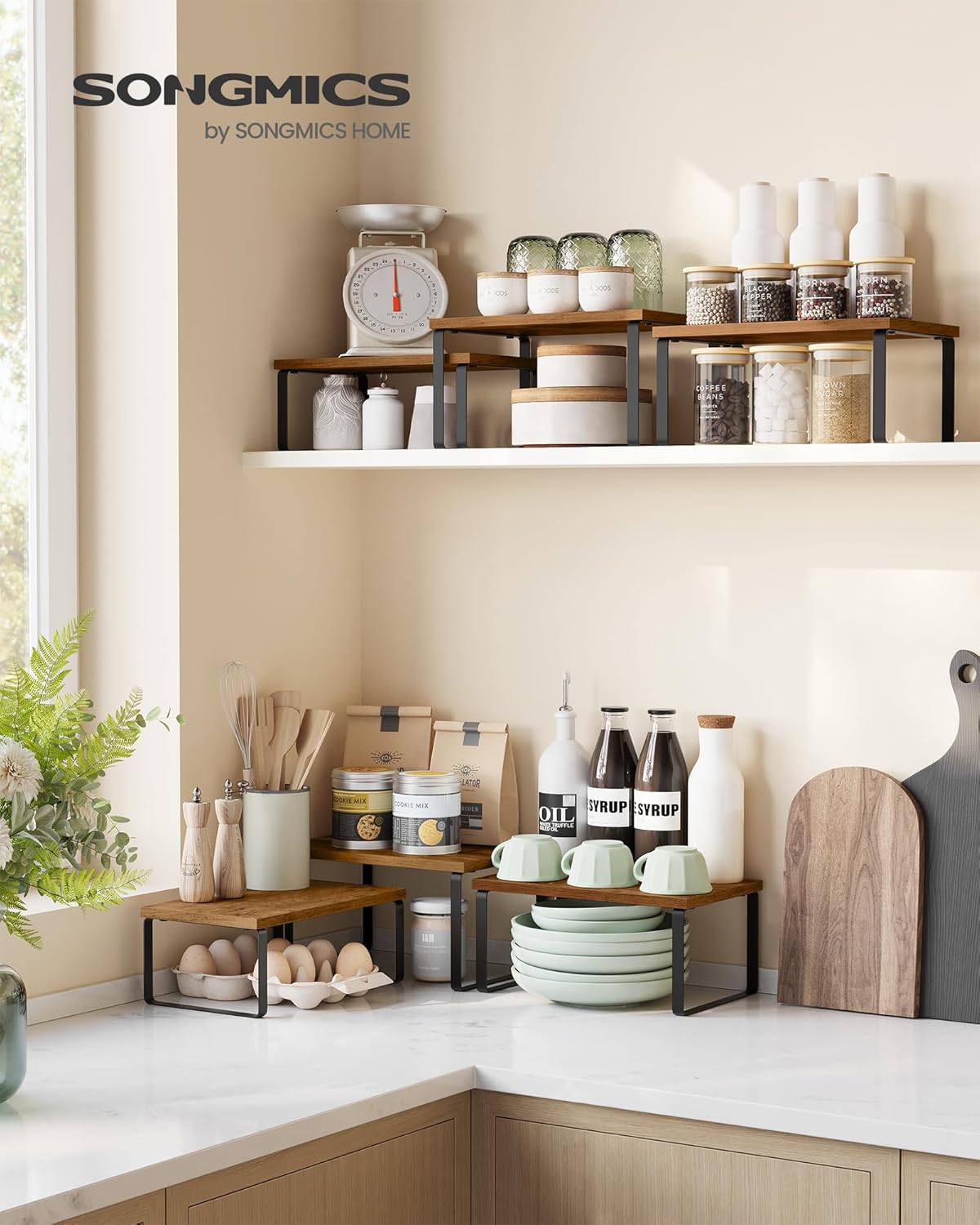• 【MULTIPURPOSE USE】Not just for the kitchen! Use these kitchen counter shelves to elevate your dining table centerpiece in the restaurant, organize makeup on your bedroom desk, or store toiletries in the bathroom