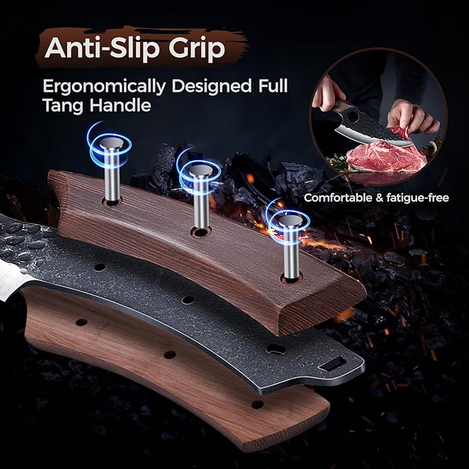 • 【Hand Forged Japanese Knife】 The knives are a masterpiece of craftsmanship, forged with precision using advanced steel technology. Its full-tang blade undergoes high-temperature heat treatment and rapid cooling, ensuring unparalleled durability and edge retention for effortless slicing, chopping, and dicing. It is built to withstand years of heavy use without losing sharpness. Ideal for professional chefs and home cooks seeking precision and reliability.