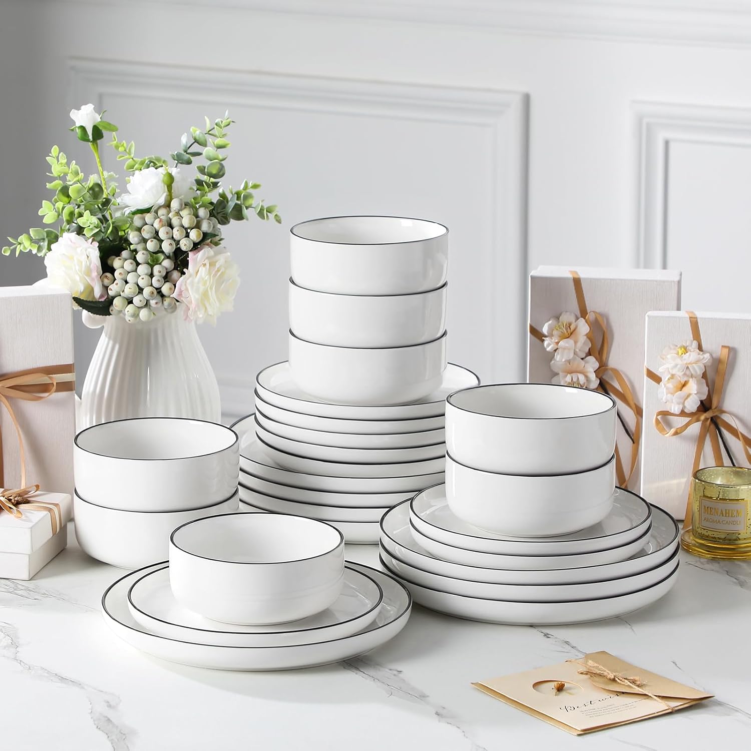 MALACASA Plates and Bowls Sets, 24 Pieces Modern Porcelain Dinnerware Set for 8 White Kitchen Dinner Dining Ware Set wtih Black Rim Ceramic Dishware Dishes Microwave and Dishwasher Safe, Series LUNA