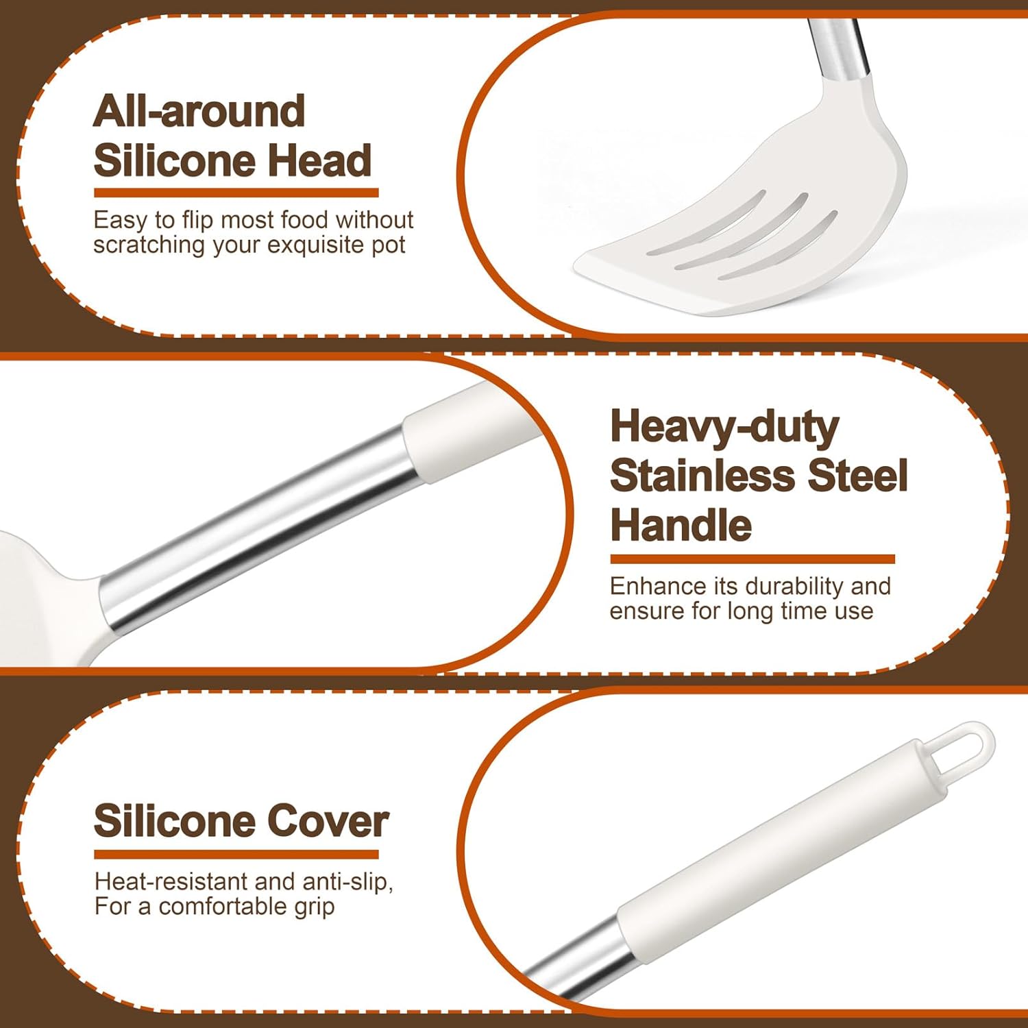 • 【Excellent Designs】All silicone utensils have smooth surfaces without rough spots, Adds a non-slipping cover on the handle end to avoid your hand get scalding, Ergonomic design of inclined angle structure between head and handle, Helping to save your effort when using, Spatula turners are designed with flexible head and slight beveled edge on the head, Perfect to slide under different food easily and comfortable to flip and fry food