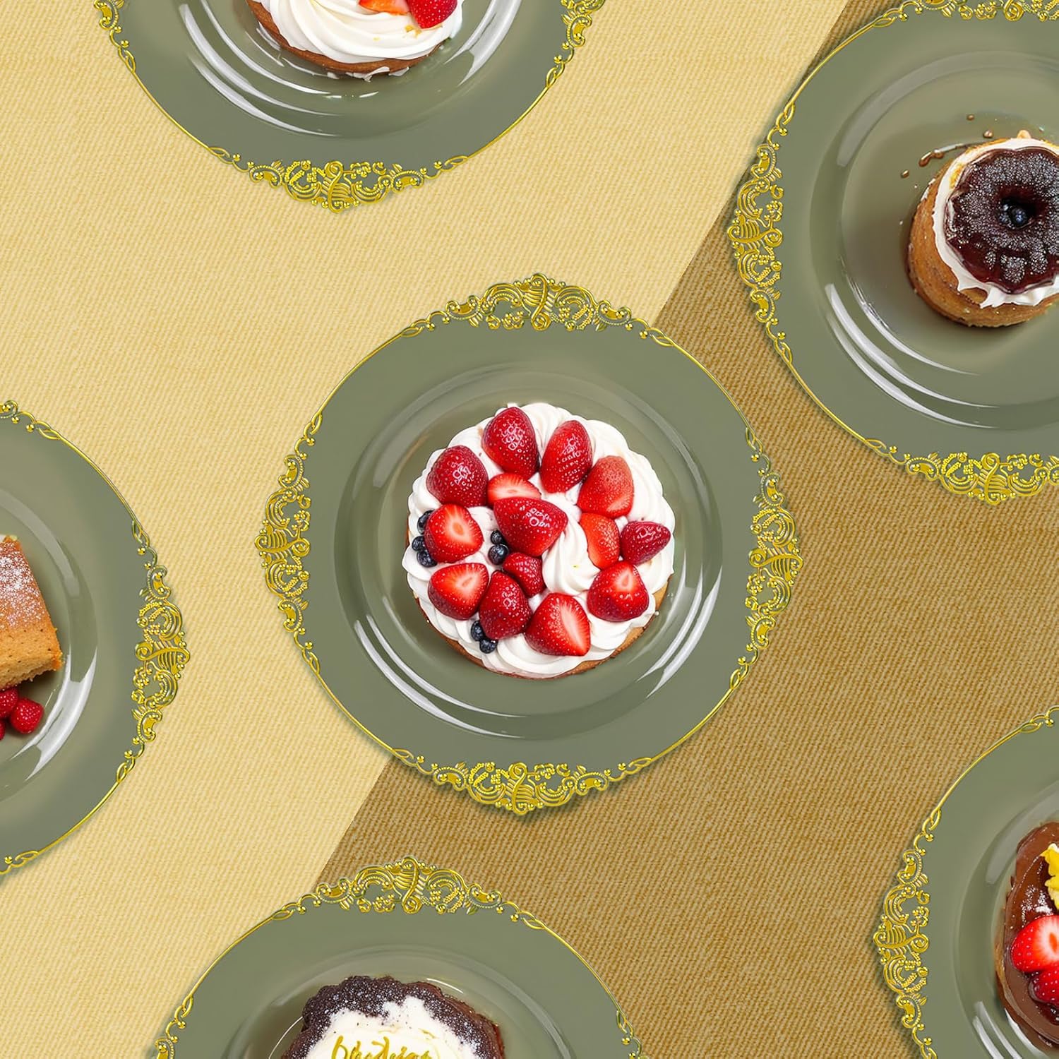 • Elegant Design: Designed for those who appreciate the finer things, our olive green plastic plates collection is a must-have for any event. The green gold disposable plates offers a seamless blend of luxury.