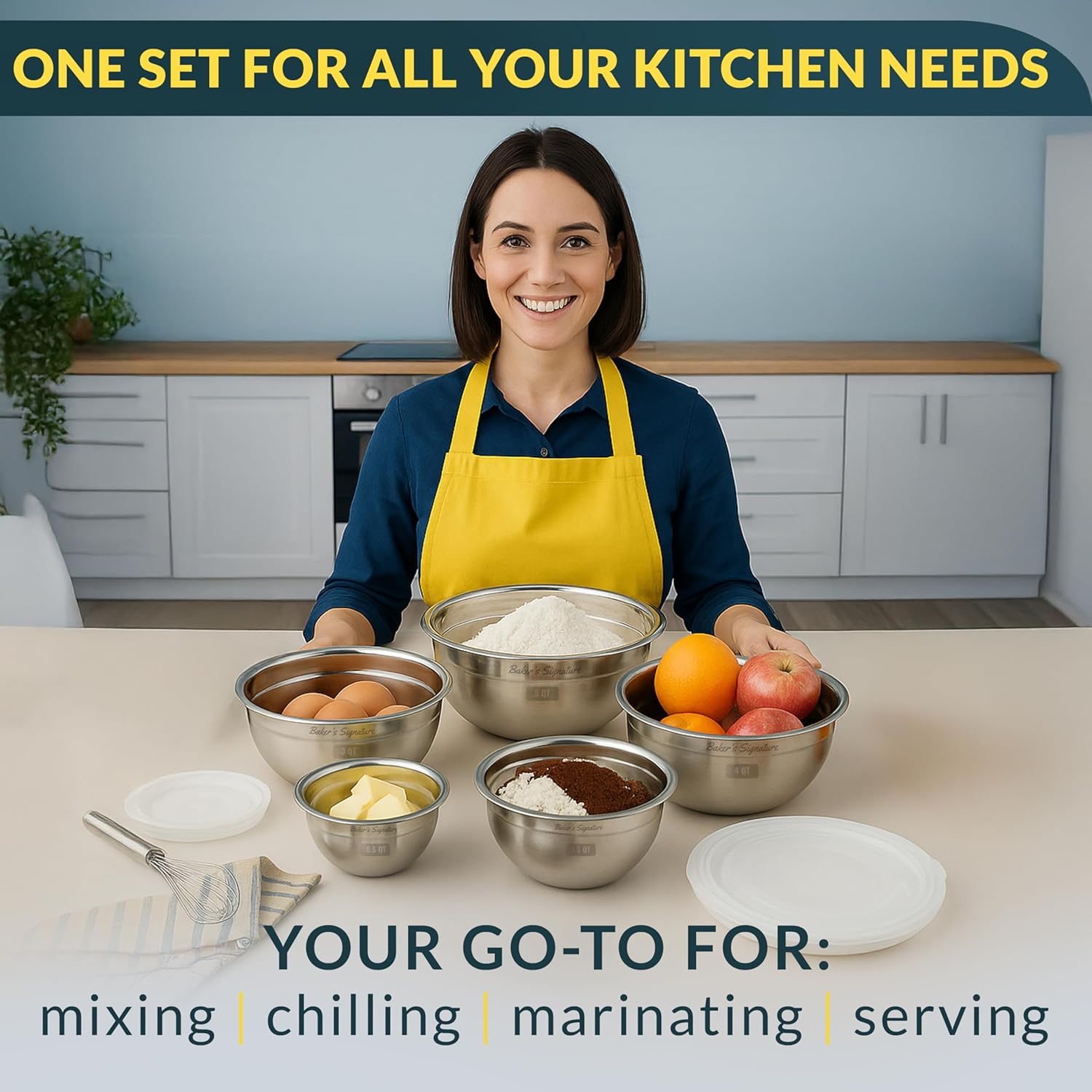 • DURABLE & LIGHTWEIGHT: Strong enough for daily use yet light enough to handle easily, this mixing bowl set features stainless steel bowl lid protection and is dishwasher safe (except lids).