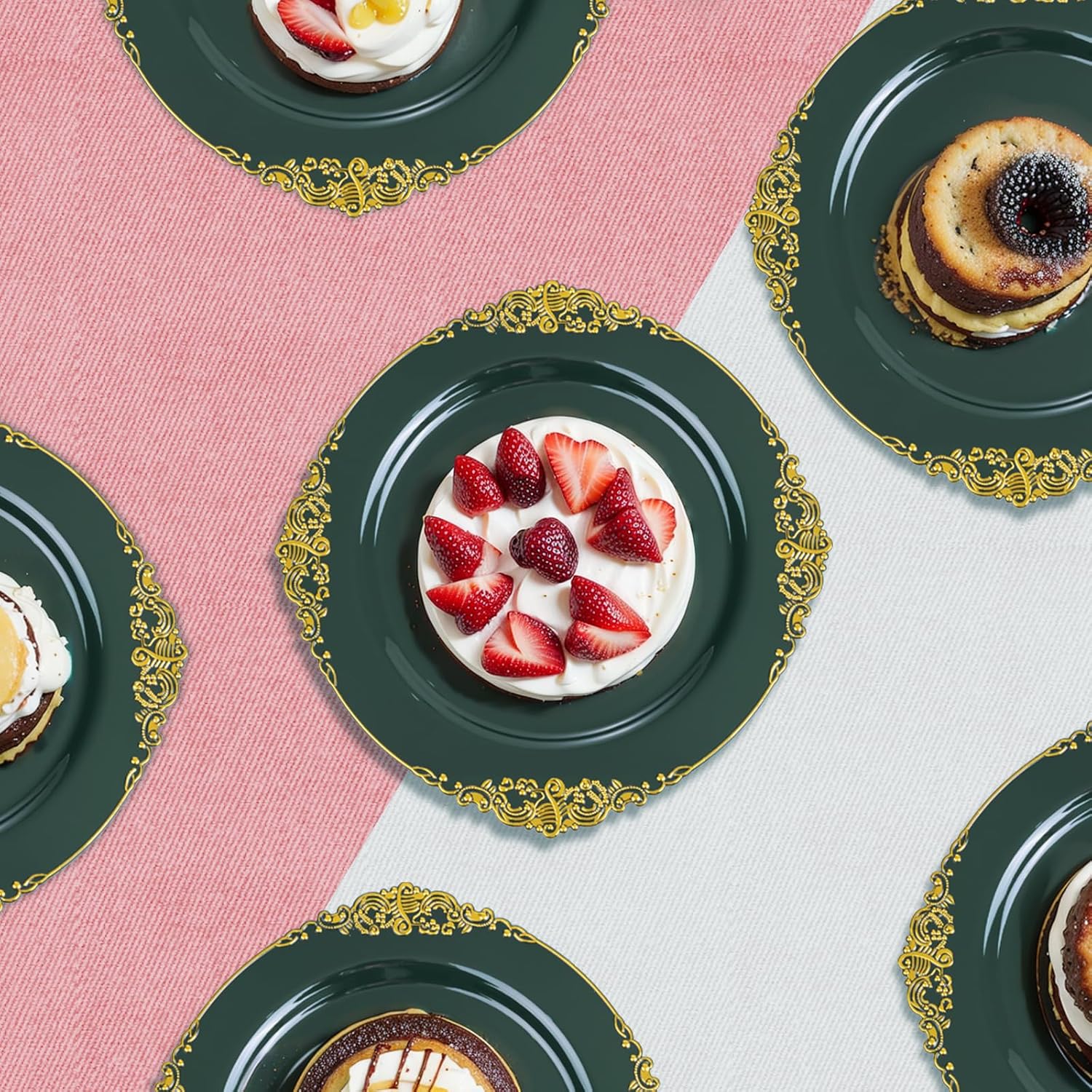 • Value Package: The Dark green plastic plates include 25 green dinner plates (10 inches) and 25 green dessert plates (7.25 inches), paired with 75 pieces of gold silverware disposable sets for a complete dining experience.