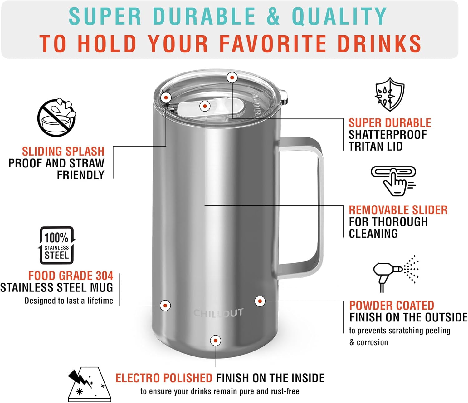 • Always With You - The CHILLOUT LIFE thermal coffee mug with handle is made of premium 18/8 food grade stainless steel for a 100% durable unbreakable coffee mug. Electro-polished on the inside, the cups stay 100% rust free. The outside of each mug is treated with a powder coating finish preventing scratching, peeling or fading. It also has a great feel & looks incredibly chic. Easy clean - it’s wonderfully convenient to use at home or on the go instead of ceramic or enamel mugs.