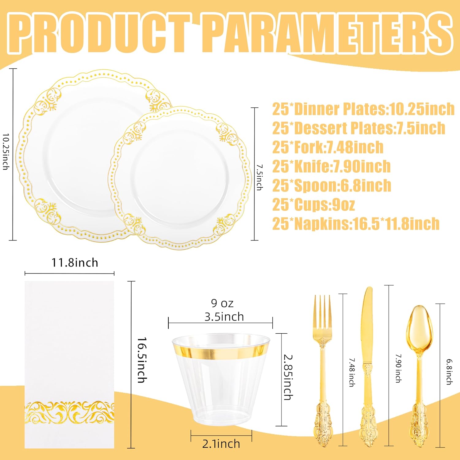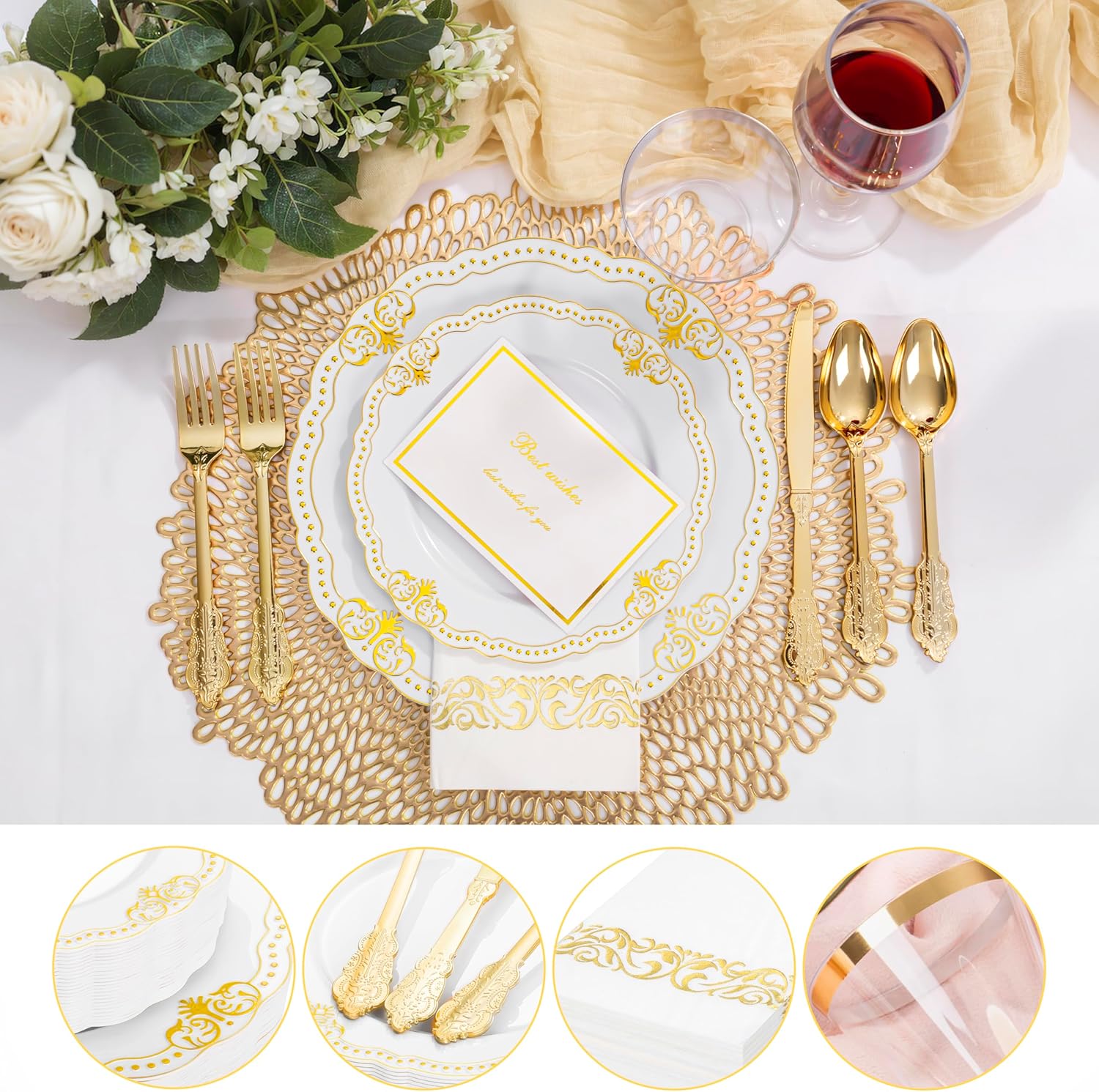 Ciaell 175 PCS White and Gold Plastic Plates - Fancy Gold Disposable Dinnerware Set with of 50 Plastic Plates, 25 Knives, 25 Forks, 25 Spoons, 25 Cups, 25 Napkins for Wedding, Party &Thanksgiving