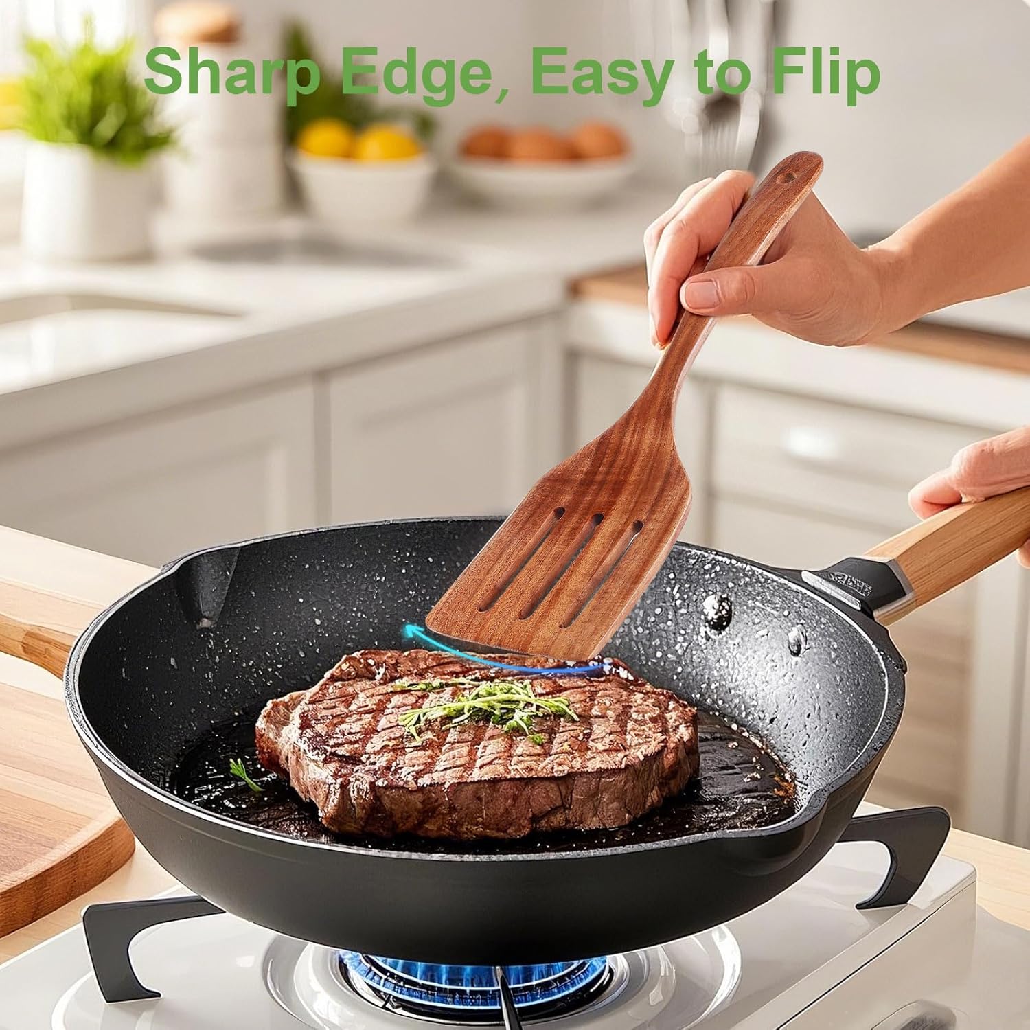 • PREMIUM QUALITY: Spatula in this cooking utensil set are crafted from sturdy, naturally sourced acacia wood. The Wooden Kitchen Utensils Set includes a solid spatula and a slotted turner. These wooden utensils feature an elegant grip design and come in practical, ergonomic sizes to meet all your cooking needs.
