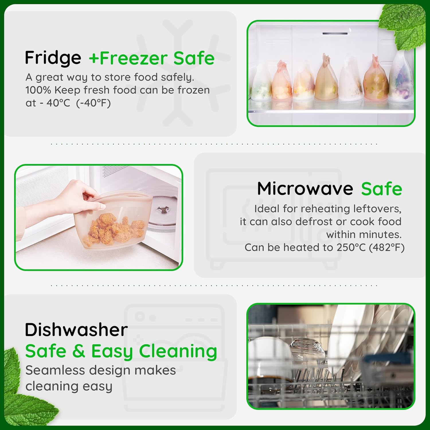 • Made with 100% platinum silicone — the same material used in medical and baby products. These silicone bags for food storage keep food fresh, odor-free, and safe for everyday family use