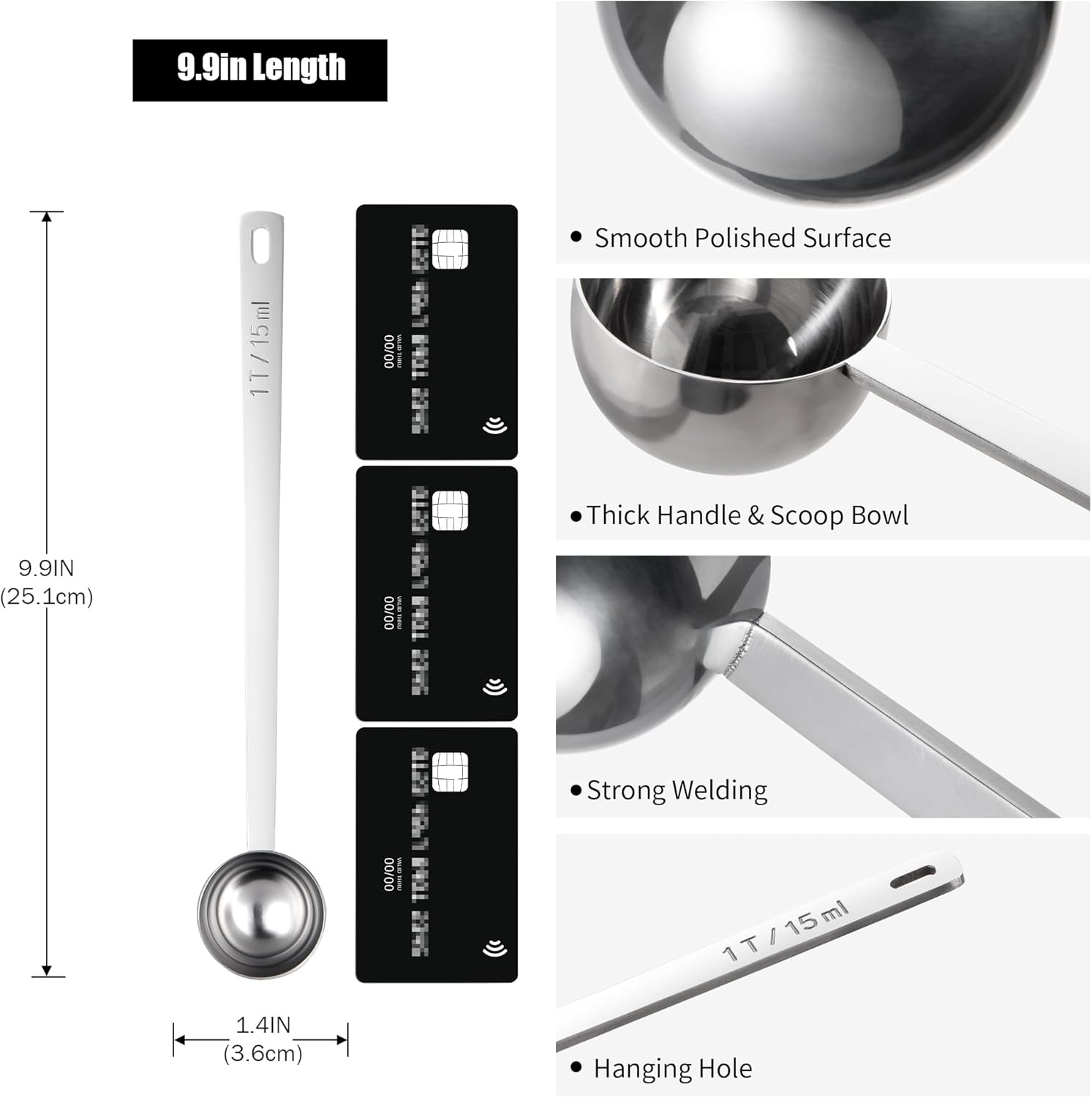• [Why does Doosu design coffee spoon with a long handle?] Doosu 9.9in long spoon with 8.5in handle allows for easy reach into deep canisters or tall jars. No need to tip the container or dig around awkwardly, making it easier to scoop out ingredients without spilling. Unlike short-handled scoops that tend to slip into the container, our long handle tablespoon scoop always within easy reach. With a hanging hole, the coffee measuring scoop stores neatly on kitchen hooks.