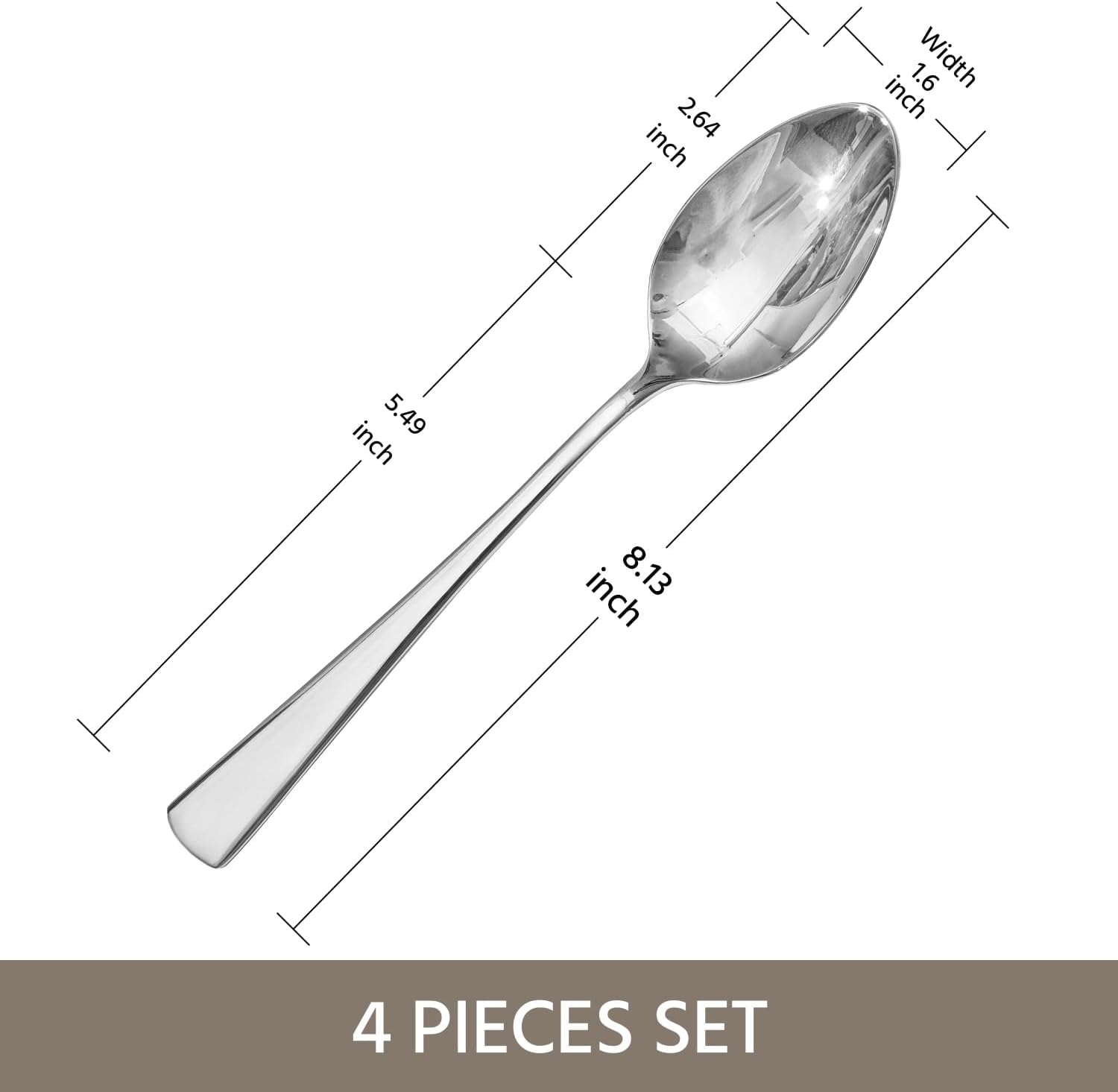 • 4-Piece Dinner Spoon Set: The dinner spoon is 8.15 inches long, with a spoon head that is 2.64 inches long and 1.6 inches wide, paired with a 5.49-inch comfortable handle for a perfect grip and serving experience. compared to common teaspoons, its larger spoon head capacity and overall size make it an ideal companion for large-capacity tableware.