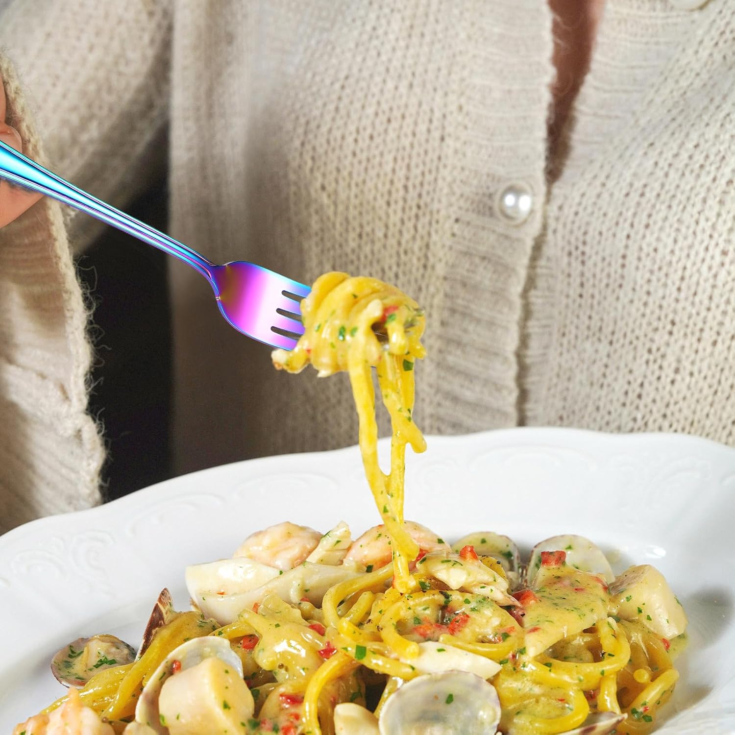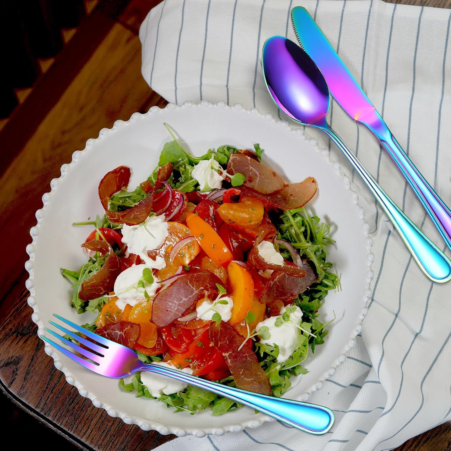 • VIBRANT COLORS: Bring a pop of color to your dining table with this vibrant set of forks, spoons, and knives. Perfect for adding a fun touch to any meal or gathering.This 20-piece flatware set is crafted from premium stainless steel with a stunning raibnow finish for a touch of elegance.Colorful cutlery dd a pop of color to your dining experience with this vibrant Rainbow Flatware Set. The double line edges handle adds a modern touch to this stylish and fun cutlery set.