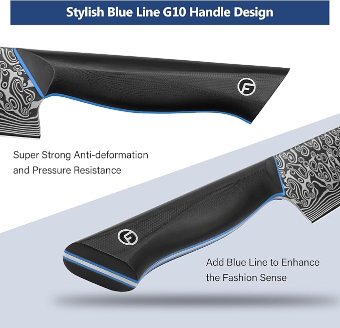 • 【Exquisite Appearance, Embellish the Kitchen】FINTISO chef knife set has an exquisite appearance design, a unique damascus pattern, a smooth blade shape, and an overall simple yet exquisite style. Put it on the knife rack to add a touch of color to the kitchen