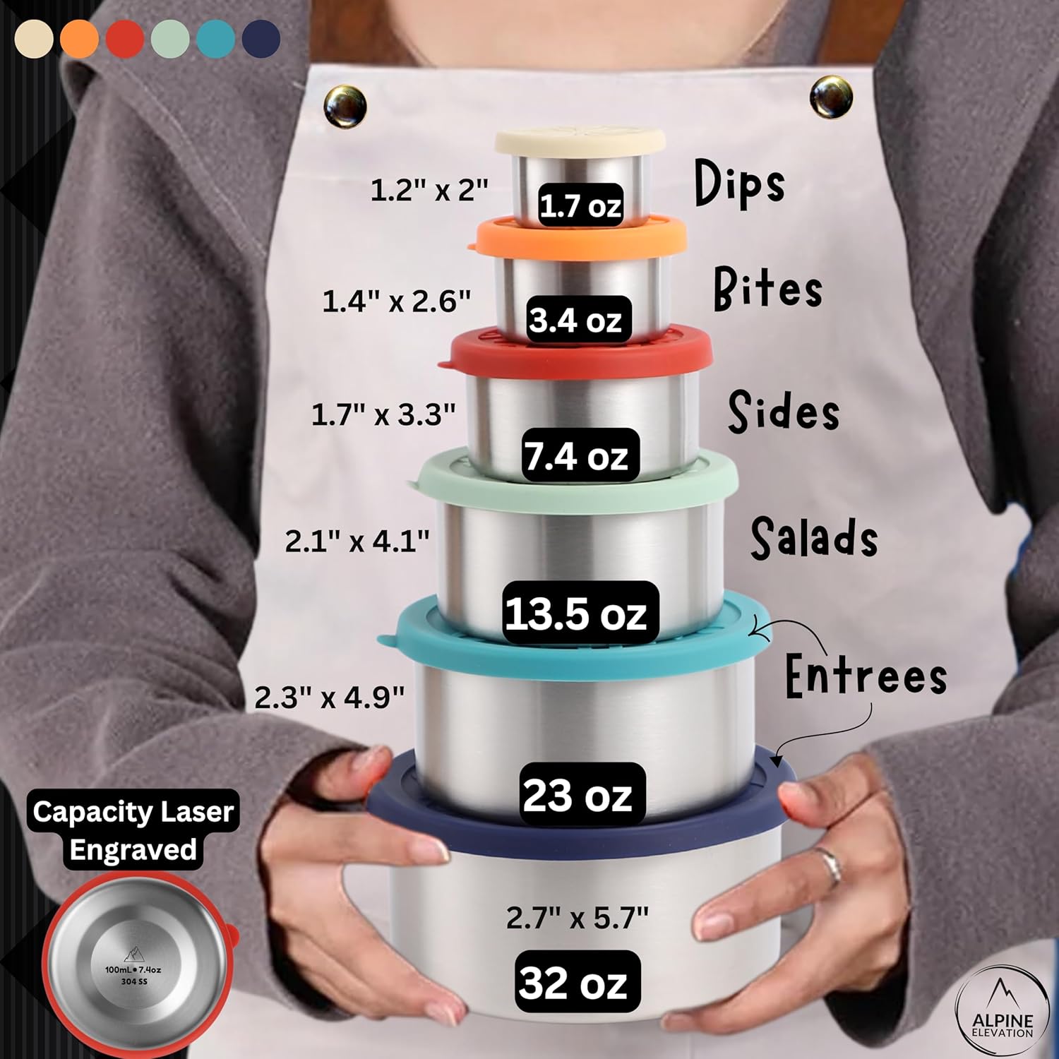 12 Pcs - 6 Stainless Steel Containers + 6 Silicone Lids | 304 Stainless Steel Snack Container | Nesting Snack and Dip Containers | Metal Food Storage