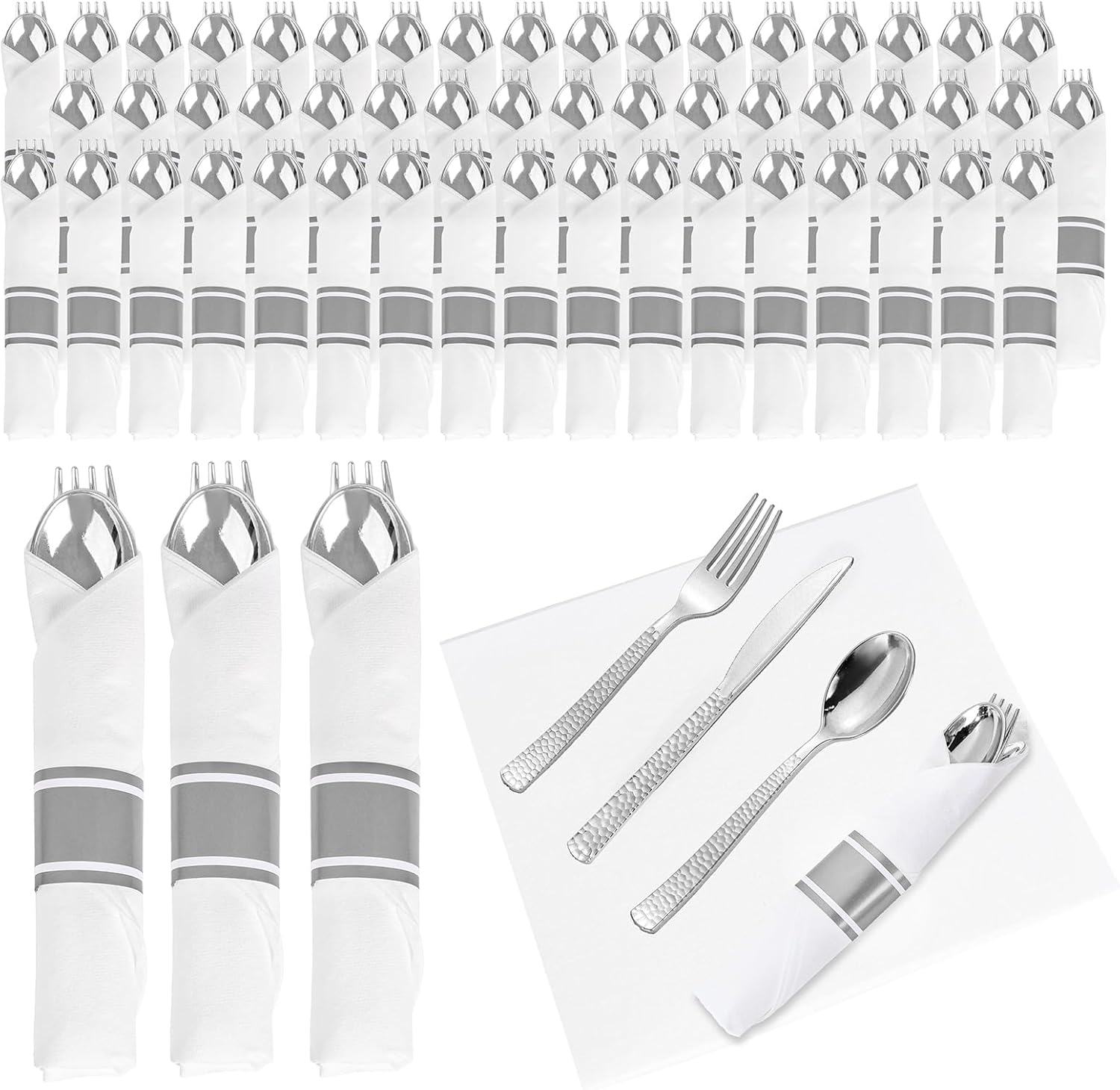 WELLIFE 400PCS Silver Plastic Silverware, Pre Rolled Silverware Set Disposable,Plastic Cutlery Includes: 100 Forks, 100 Knives, 100 Spoons, 100 Napkins, Cutlery Set Disposable