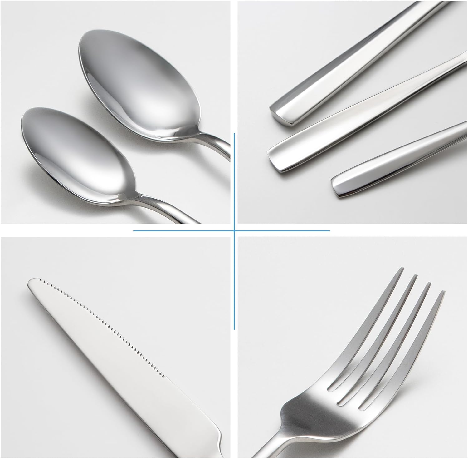 • 【Exquisite Workmanship & Easy Clean】Crafted forged process, strong and durable so that the forks spoons and knives set have a thicker texture. Good workmanship, high quality silverware set is highly mirror polished for the luxury look, keeps shiny and new to match well with your tables, smooth edges without rough spots ensure the safety of your lips and hands, sleek surface makes cleaning easier and dishwasher safe for saving time and labor