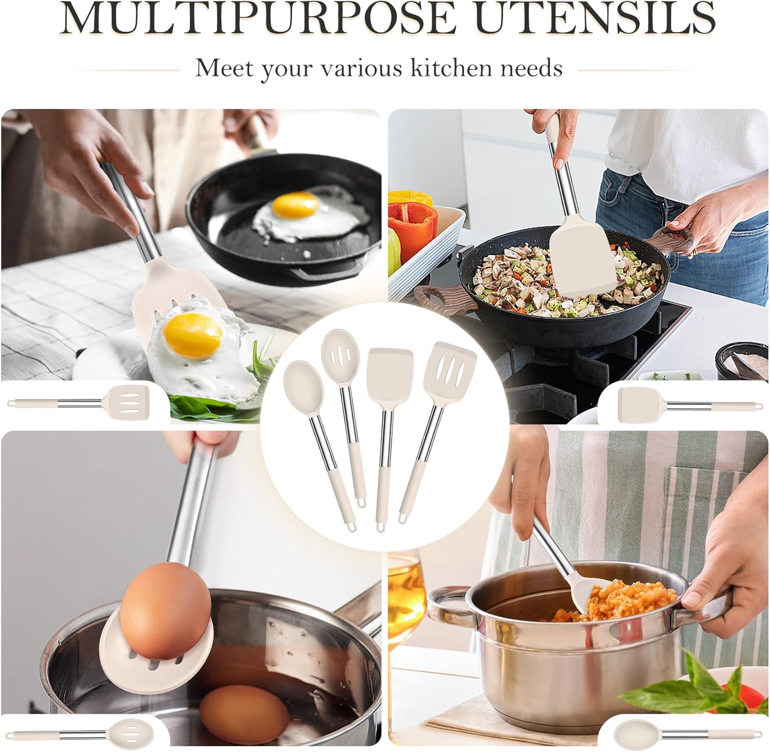 • THOUGHTFUL DESIGNS – The stainless steel handle covered with silicone sleeve for better insulation and non-slip handle is ergonomically for a comfortable grip, Slotted turner and spoon are convenient to strain out excess grease to let you have a healthier meal, Khaki and metallic silver construction matches nicely with any color-coordinated kitchen