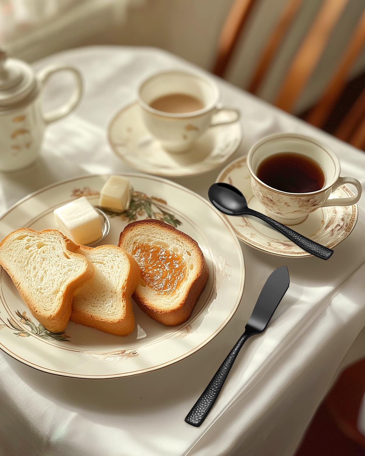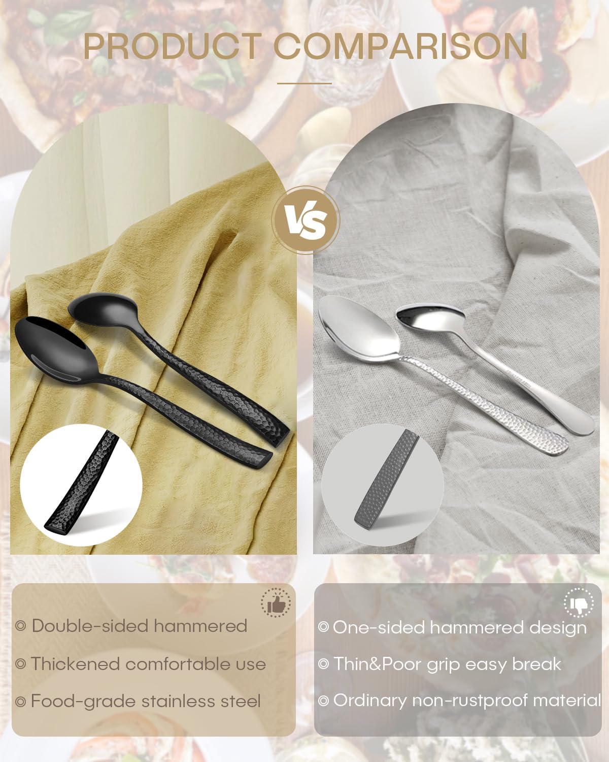 • Hammered Silverware Set For 12: Total 65pcs Black Silverware Set include 12x dinner forks, 12x salad forks, 12x dinner spoons, 12x dessert spoons, 12x dinner knives. Extra matching 5-piece black serving set, 1x serving spoon, 1x slotted serving spoon, 1x serving fork, 1x sugar spoon and 1x butter knife. Perfect for any occasion, such as daily use, family dinners, party, or formal events