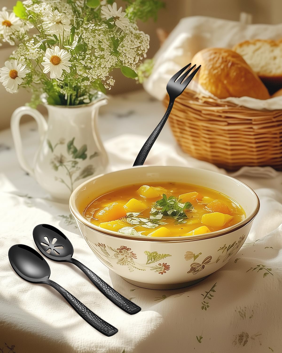 • OLLEX Support: If you have any questions about our Hammered Silverware Set with serving pieces, please contact us anytime, and we will provide timely assistance in resolving. Elevate your dining experience and create lasting memories with this black silverware set for 12