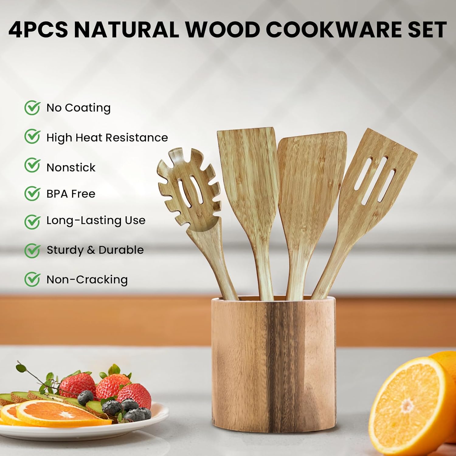 GEEKHOM Bamboo Spatulas for Nonstick Cookware, 13 Inch Wooden Kitchen Utensils, 4 Pack Wooden Spatula for Cooking, Slotted Wok Turners, Flipper for Pancake, Fish, Egg