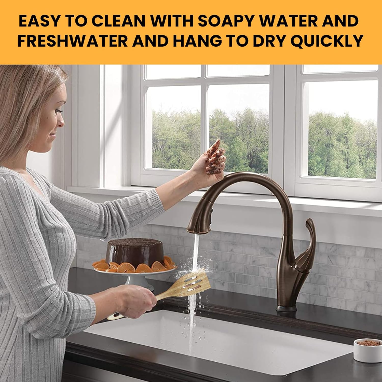 • Safe and Natural Bamboo Kitchen Utensil: These cooking utensils are made of the 100% bamboo, eco-friendly, oderless, healthy for your family; The low carbon manufacturing bamboo spatula contribute to green living that help conserve resources, also thery can fit various wok and pan