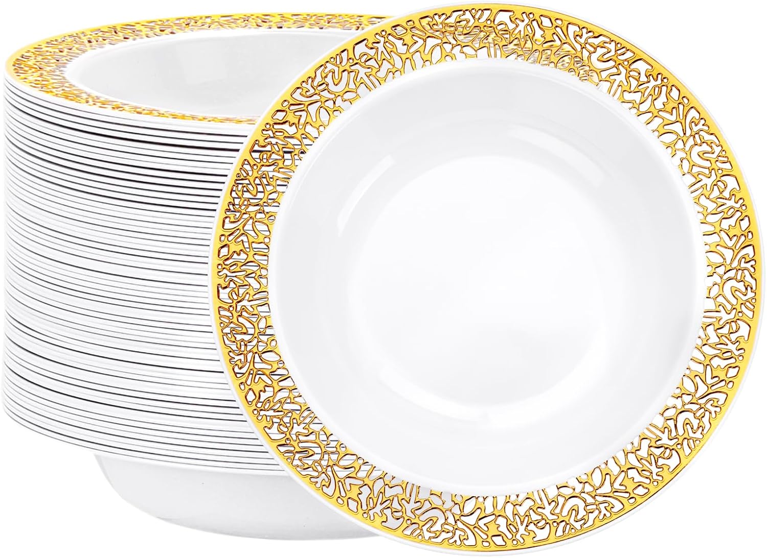 • Elegant Gold-Trim Design:Featuring a sophisticated gold lace rim, these white bowls add a luxurious touch to any table setting. The wide, spill-resistant rim makes the disposable soup bowls easy to hold, even with hot soup or saucy dishes—no burns or mess!