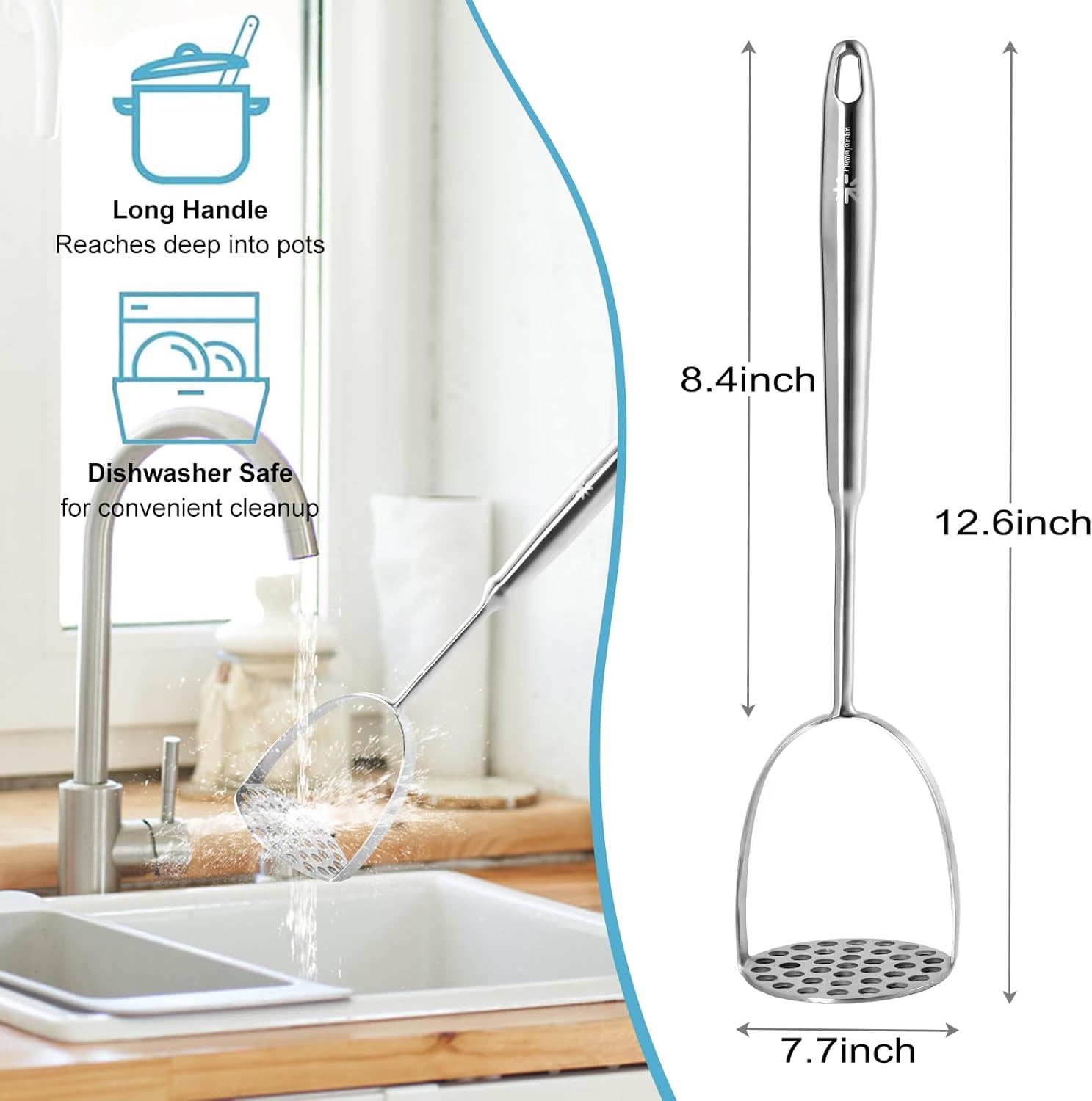 • ✓ ZERO CLEANUP HASSLE: This food masher kitchen tool 100% dishwasher-safe stainless steel construction. No crevices for food traps - simply toss in the dishwasher after mashing sticky sweet potatoes or oily ground meat. Maintains mirror shine through 1000+ washes.