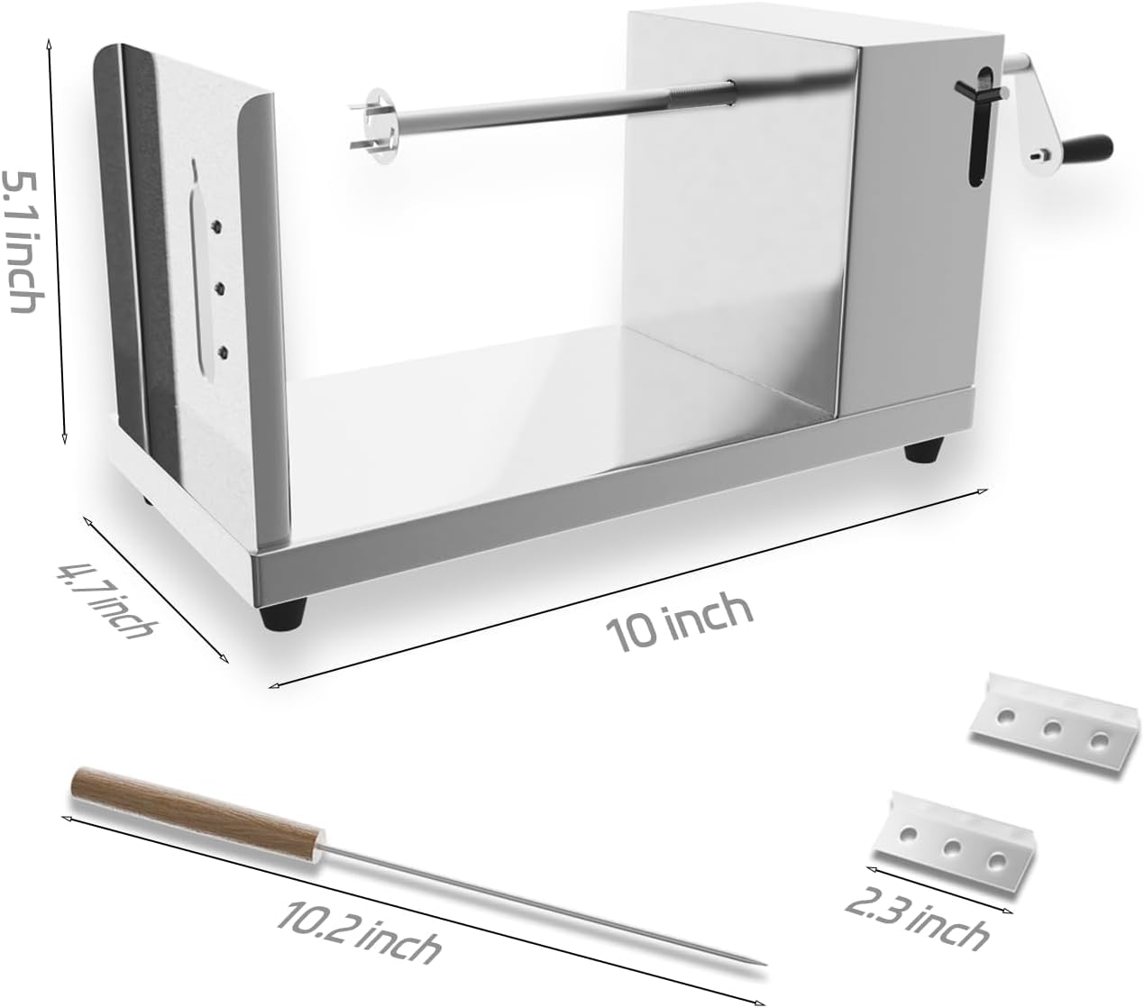 • SIZE AND PACKAGE: Tornado potato cutter measures 10 inch (L) x 4.7 inch (W); Nicely packaged: 1 x tornado potato cutter, 2 x replacement blades, 1 x sharp drill, 1 x manual