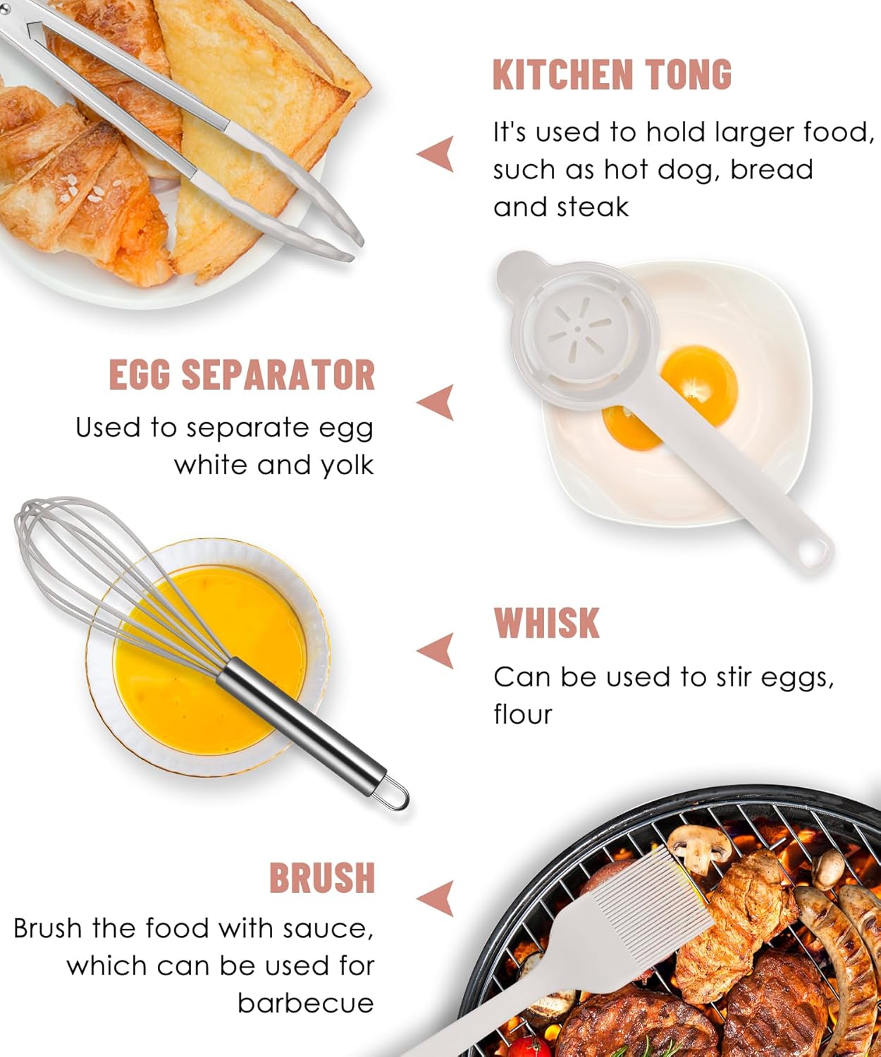 • ❤【12Pcs Kitchen Utensils to Use】This silicone cutlery set is perfectly suited to your kitchen needs, including 1 x Ladle,1 x Spoonula,1 x Slotted Spoon,1 x Pasta Fork,1 x Kitchen Tong,1 x Slotted Turner,1 x Whisk,1 x Brush,1 x Large Spatula,1 x Small Spatula,1 x Egg Separator, 1 x Holder. You will have all the basic cooking tools you need in your kitchen!