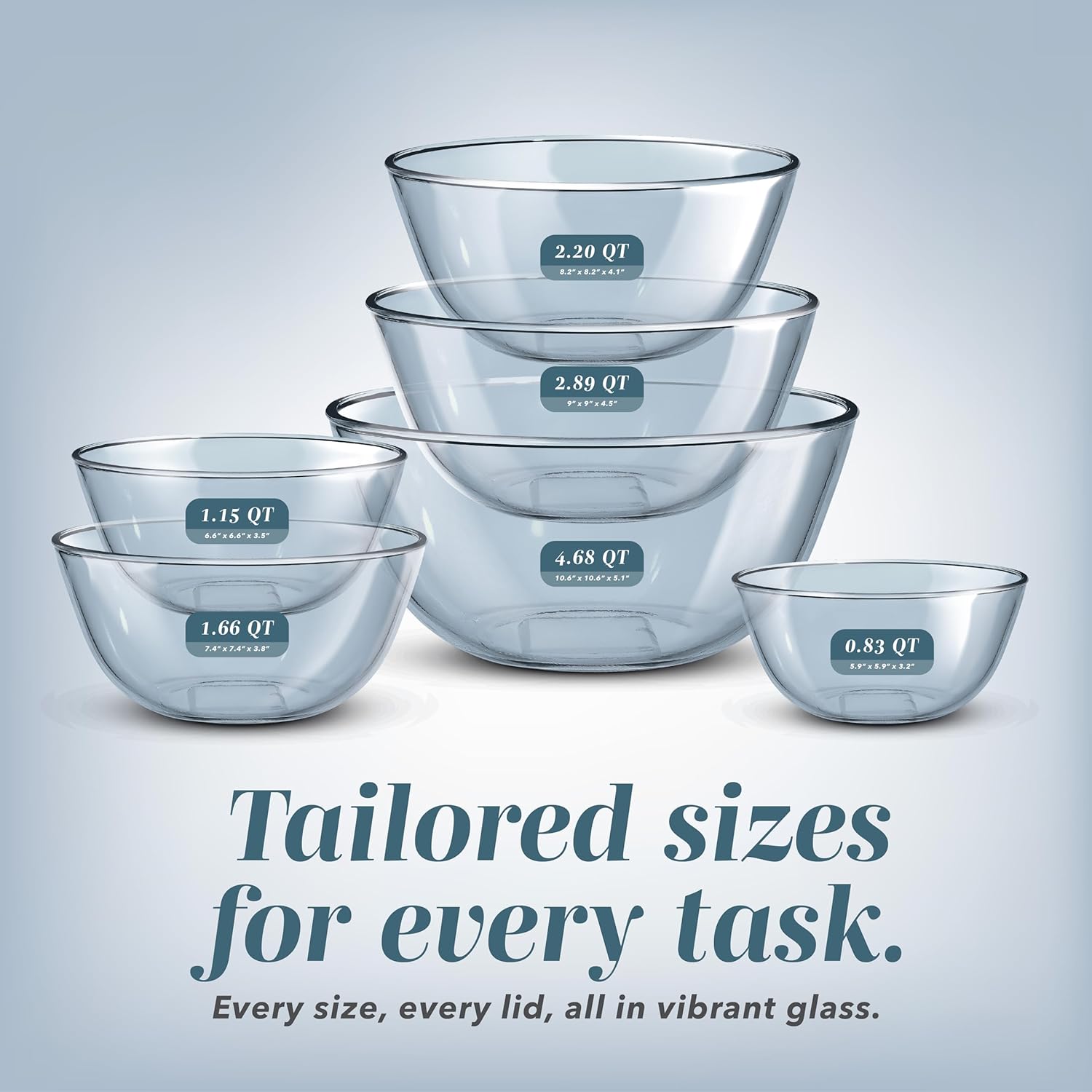 • Complete 12-Piece Set: Includes 6 colored glass mixing bowls with 6 airtight lids – perfect for food storage, meal prep, and serving all in one. The set includes bowls with capacities of 26.72 oz, 36.85 oz, 53.25 oz, 70.67 oz, 92.66 oz, and 149.85 oz, all made from high borosilicate clear glass with colored lids.