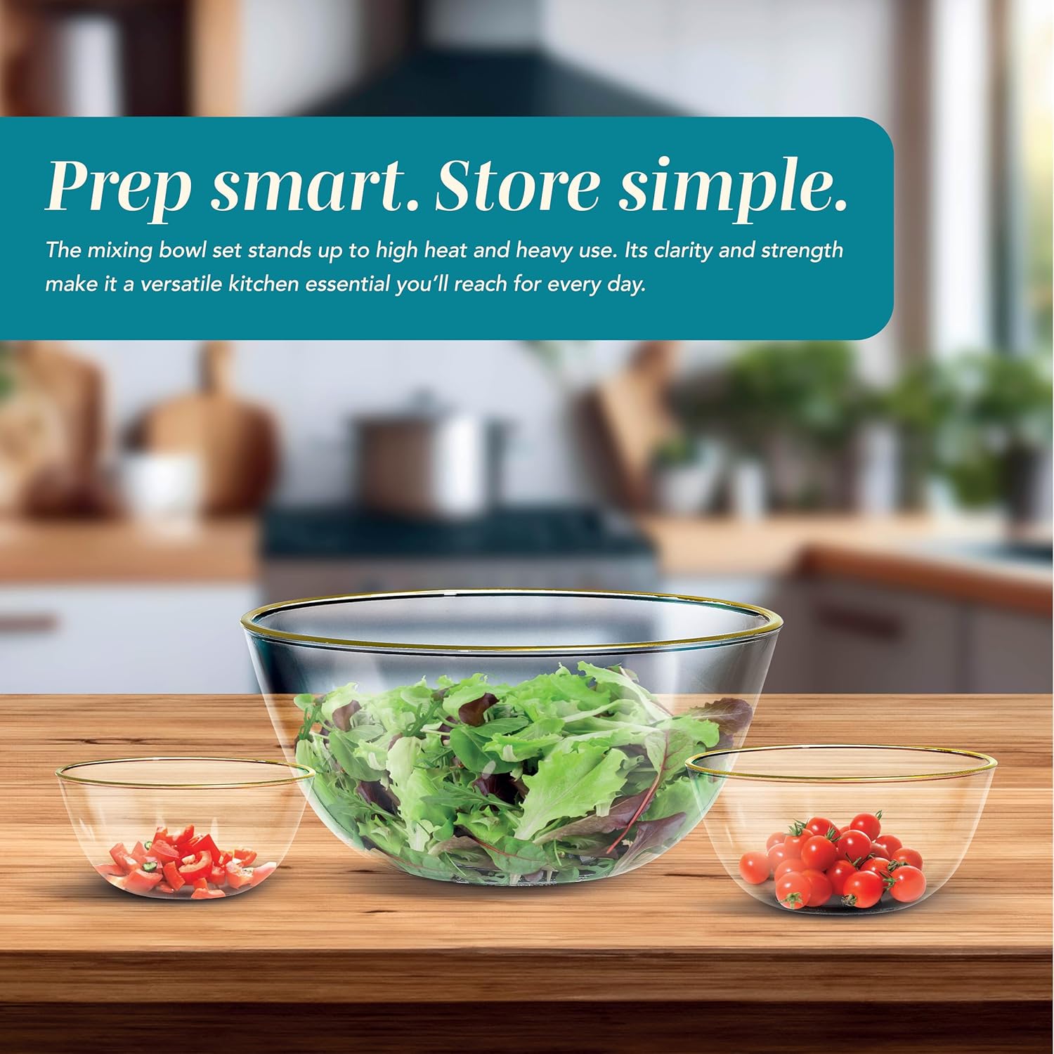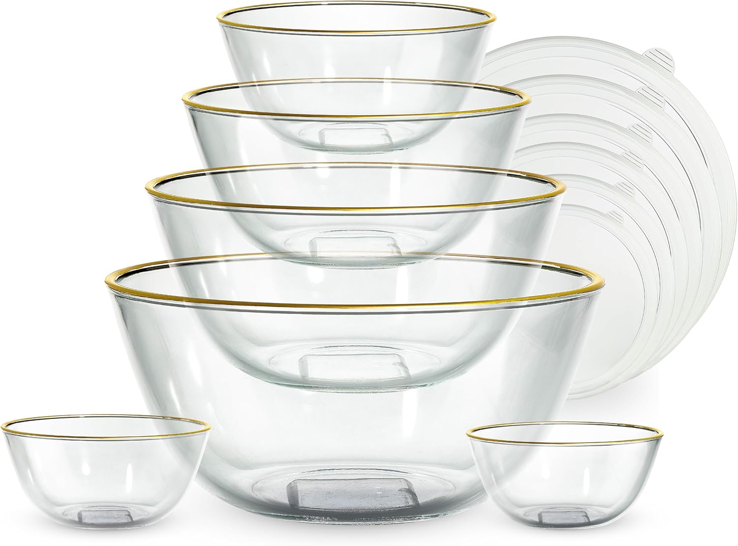 • Complete 12-Piece Set: Includes 6 glass mixing bowls with a gold rim and 6 airtight lids – perfect for food storage, meal prep, and serving all in one. The set includes bowls with capacities of 26.72 oz, 36.85 oz, 53.25 oz, 70.67 oz, 92.66 oz, and 149.85 oz, all made from high borosilicate clear glass with colored lids.