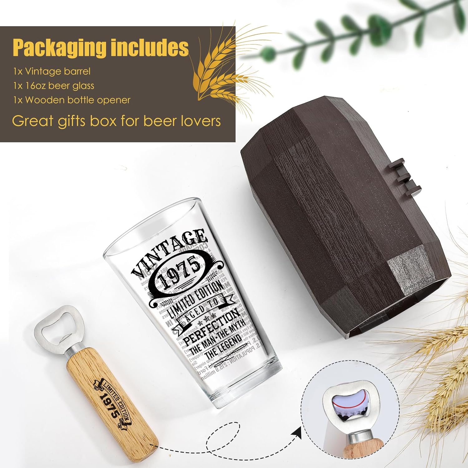 • Turning 50 Present- – The engraved limited edition beer glass with “Vintage 1975 Aged to Perfection,” paired with a rustic wooden beer barrel and a matching bottle opener, adds a 50th birthday keepsake touch to any celebration.