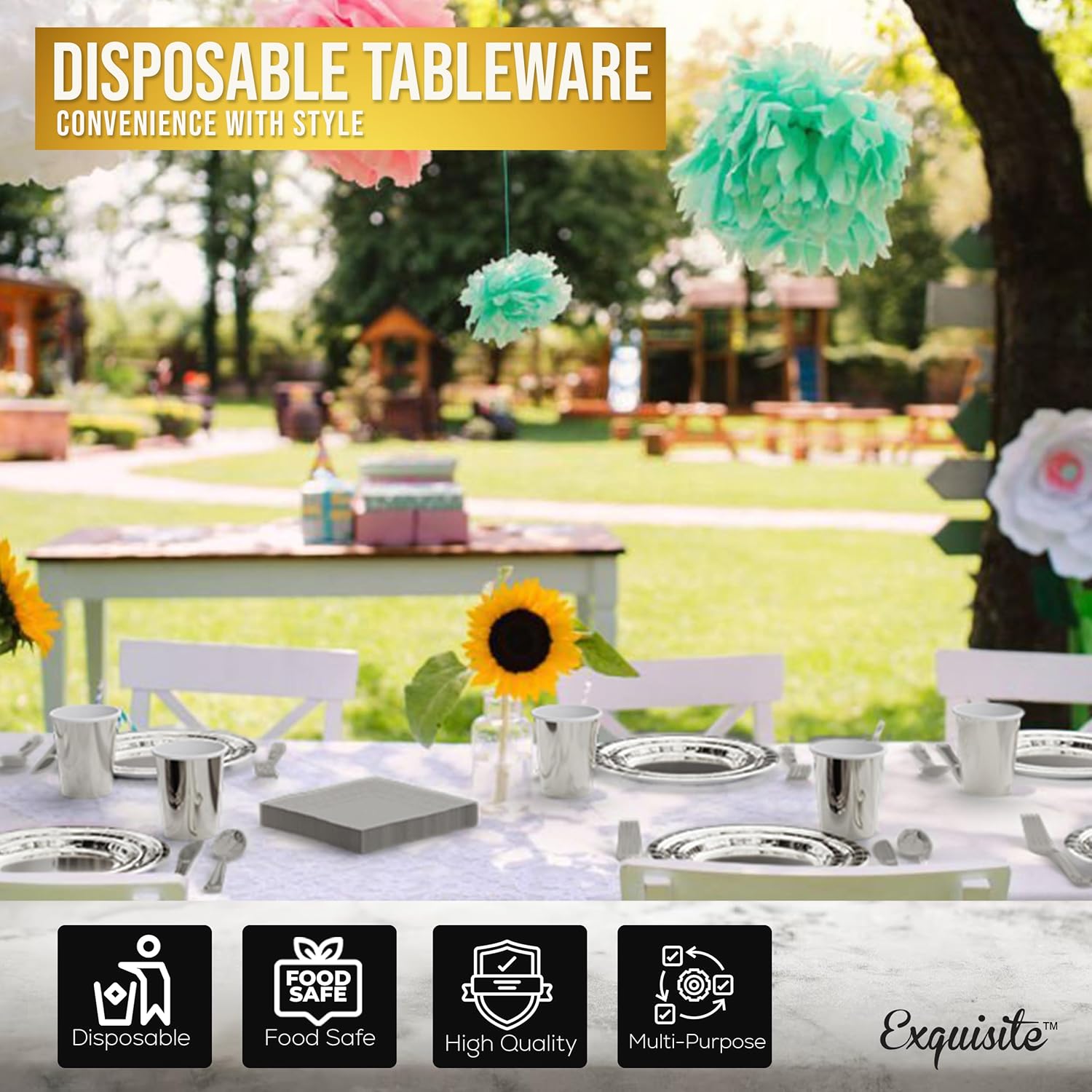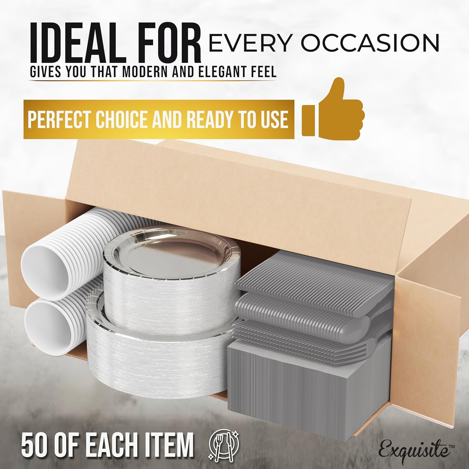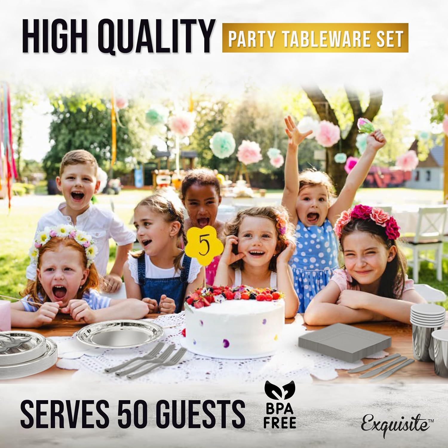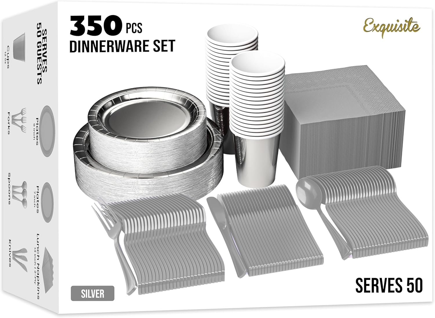 Exquisite 350 Pcs Silver Paper Plates For Party, Silver Disposable Plates Set, 50 Of Each 9" Dinner Plate Set, 7" Dessert Plate, Cups, Napkins & Cutlery Paper Dinnerware
