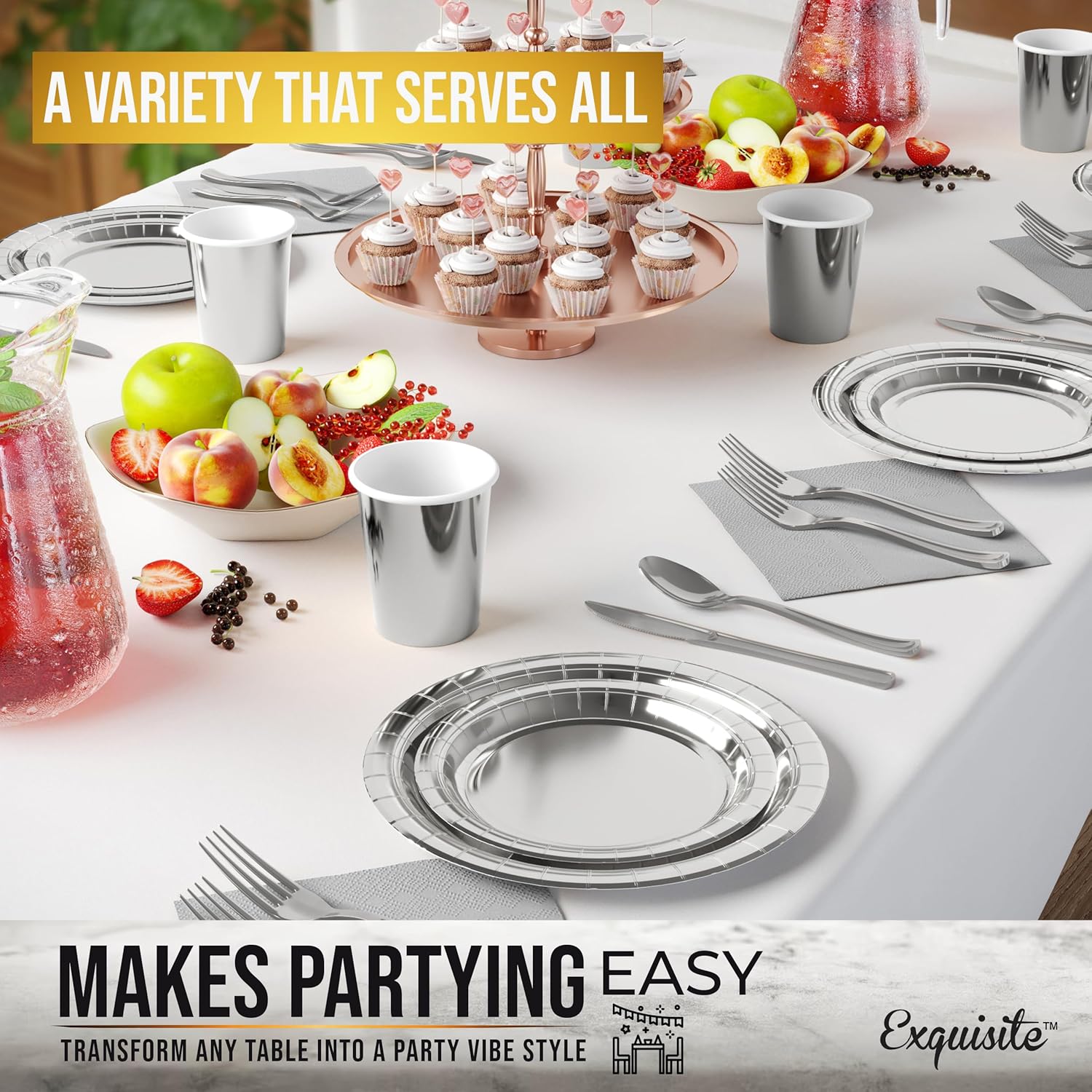 • All Occasions: From family dinners to special events, our silver plates will add style to your table. These silver paper plates for party sets, complete with napkins, utensils, & paper cups, are great for parties or daily use. The plates and napkins party supplies are a must-have for a seamless dining experience. Enjoy our disposable silver plates set at your next event!
