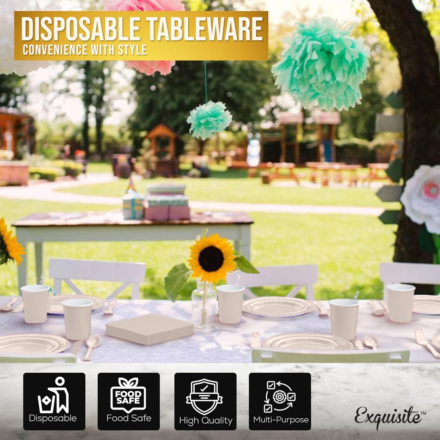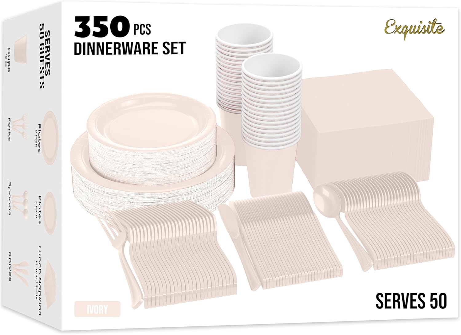 Exquisite 350 Pcs Ivory Paper Plates For Party, Ivory Disposable Plates Set, 50 Of Each 9" Dinner Plate Set, 7" Dessert Plate, Cups, Napkins & Cutlery Paper Dinnerware