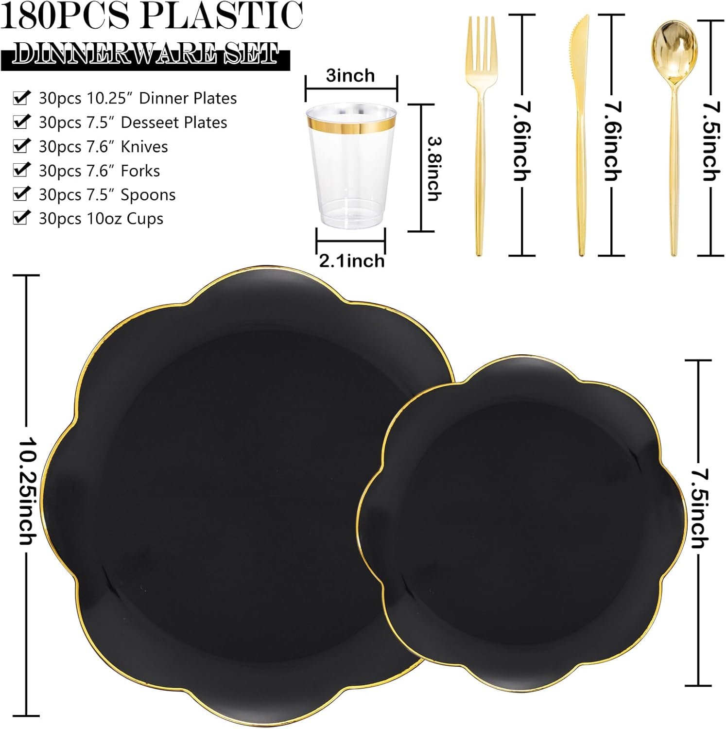 • Effortless Elegance with Complete Set: Eliminate the guesswork of tableware coordination! Our black plastic plates come perfectly paired with gold plastic silverware, forming a stunning Black and Gold Plastic Dinnerware Set. Achieve an instantly cohesive and sophisticated table setting, saving you time and ensuring a seamless look for any event.​